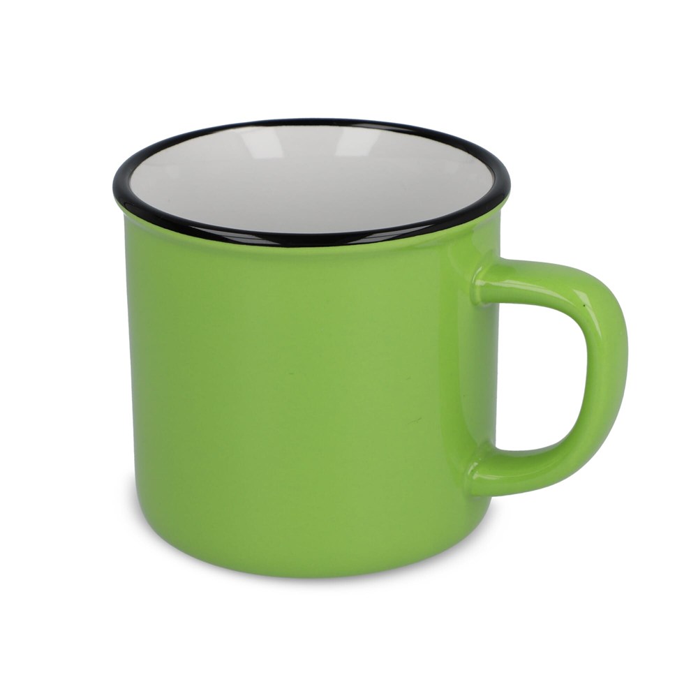 Deze keramische mok in emaille-stijl combineert vintage charme met levendige kleuren. Perfect voor koffie, thee of elk warm drankje, het heeft een klassiek ontwerp met een glanzende afwerking en een zwarte rand, die de essentie van traditionele emaille mokken uitstraalt. Ideaal voor thuis of op kantoor, het voegt een tijdloze uitstraling toe aan elke mokkencollectie.