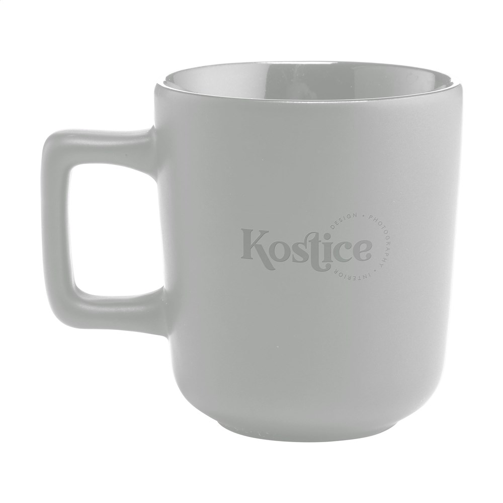 Mok van hoogwaardig keramiek met een opvallend oor. Afgewerkt met een matte buitenzijde en hoogglans binnenzijde. Vaatwasserbestendig. De opdruk is vaatwasmachine getest en gecertificeerd: EN 12875-2. Inhoud 280 ml. OPMERKING: De witte mok kan niet worden voorzien van een lasergravure omdat deze onvoldoende zichtbaar is.