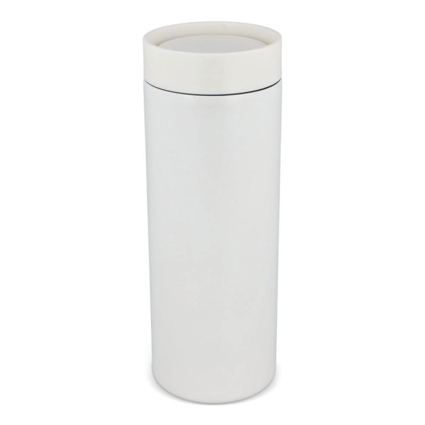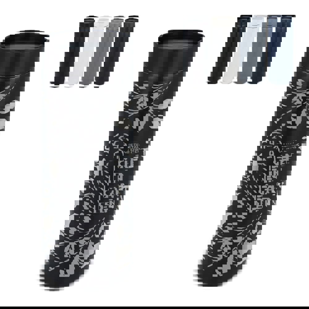 Modern ontworpen thermobeker van gerecycled roestvrij staal (400 ml). Met een lekvrije 360-graden drinkdop. Lasergegraveerde logo's hebben een chroomeffect, maar ook een digital high gloss bedrukking zorgt voor een subtiel effect. Per stuk verpakt in een geschenkdoos.
