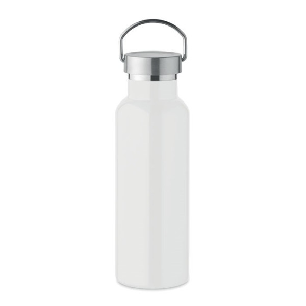 Dubbelwandige isolerende vacuümfles van gerecycled roestvrij staal (90% gerecycled RVS en 10% RVS) en dop voorzien van handvat. Inhoud: 500 ml.