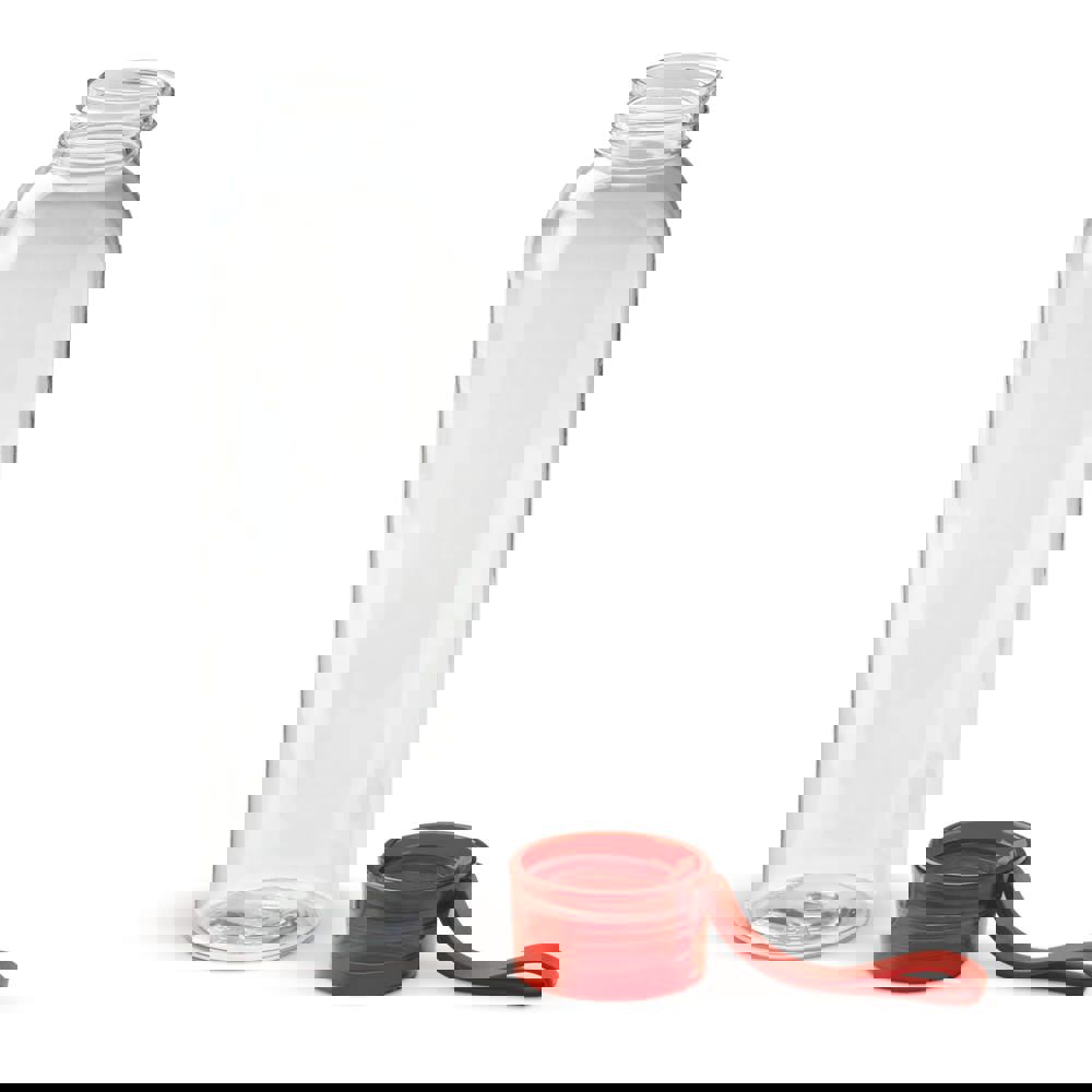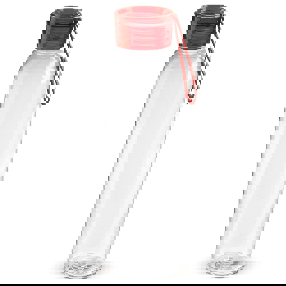 Enkelwandige drinkfles van Tritan materiaal met transparant gekleurde dop. Deze fles is uitgerust met een handige siliconen band zodat deze eenvoudig te dragen is of om bijvoorbeeld aan een tas te bevestigen. De fles is alleen geschikt voor koude, niet-koolzuurhoudende dranken en is BPA vrij. Geleverd in een geschenk verpakking.