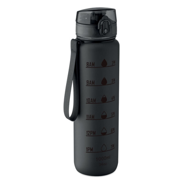 Sportwaterfles van RPET, motiverende tijdsaanduiding, met één hand te openen flip top deksel, veiligheidsslot en draagband. Lekvrij. Inhoud: 1L.