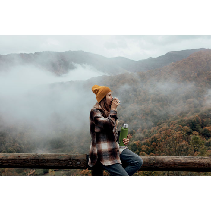 Dubbelwandige vacuüm isolerende fles van gerecycled roestvrij staal ( (90% gerecycled roestvrij staal en 10% roestvrij staal) met handvat aan de zijkant. Met PP deksel en gerecyclede roestvrijstalen beker. Lekvrij. Inhoud: 1L.