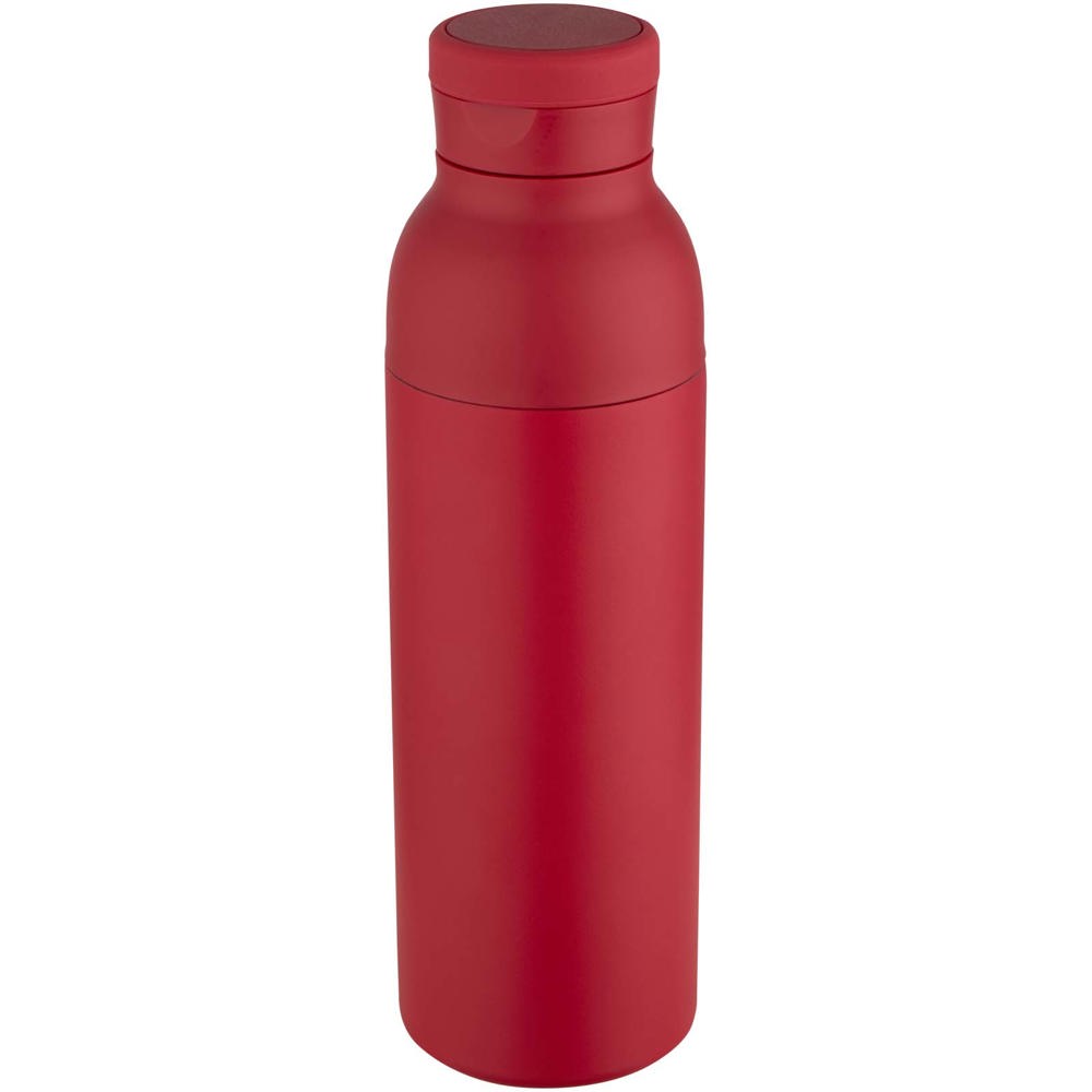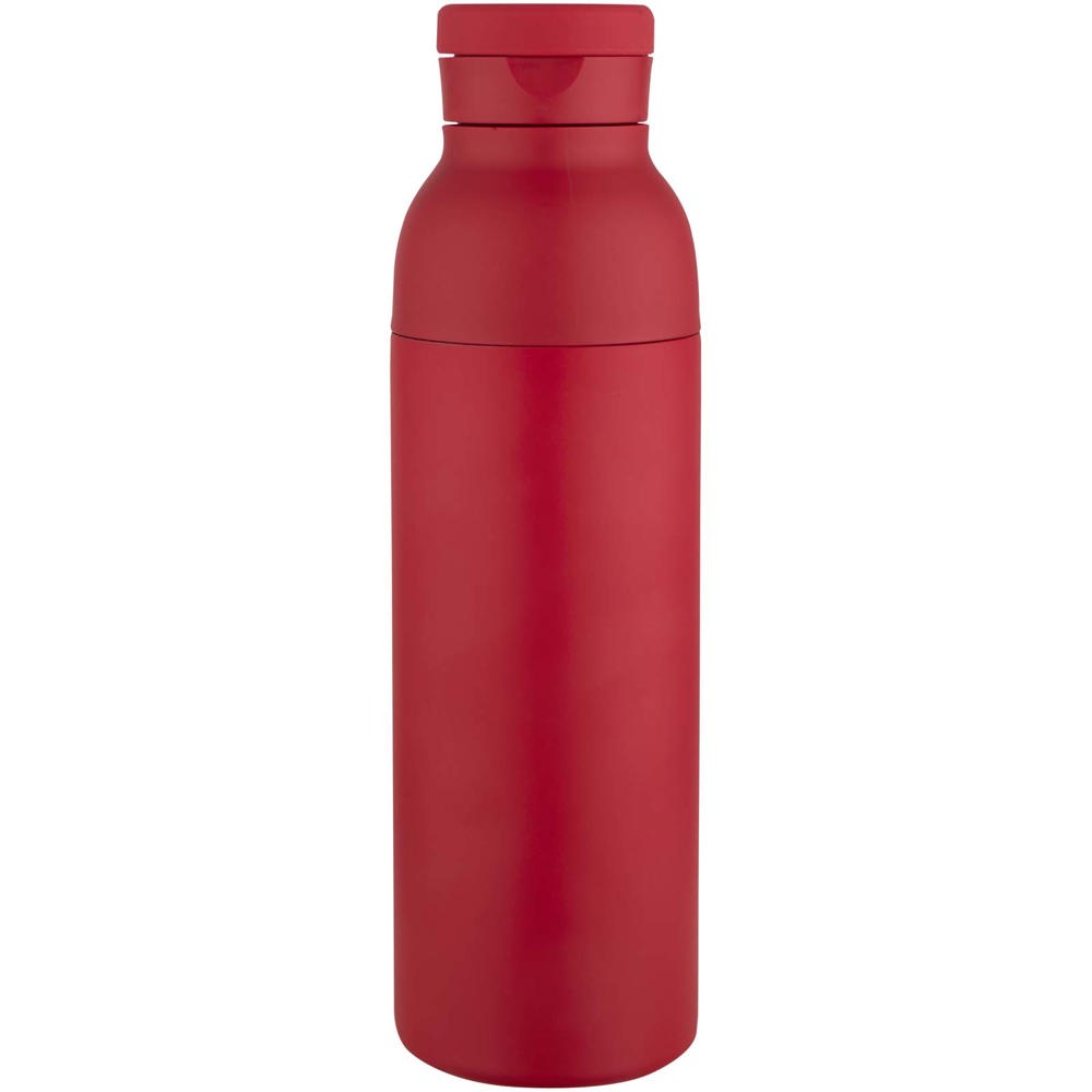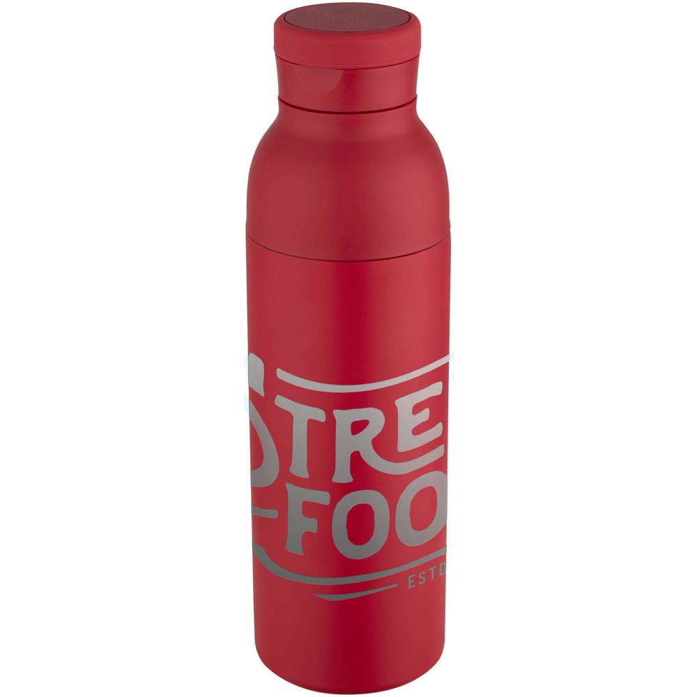 Dubbelwandige, vacuümgeïsoleerde waterfles van RCS-gecertificeerd roestvrij staal, voorzien van een discreet geïntegreerde siliconen draaglus in de dop. Houdt dranken tot 48 uur koud of tot 12 uur warm. De tweedelige constructie maakt het reinigen eenvoudig, terwijl de duurzame poedercoating en kopercoating zorgen voor langdurige prestaties. Geleverd in een gerecyclede kartonnen geschenkverpakking. Inhoudscapaciteit: 650 ml.