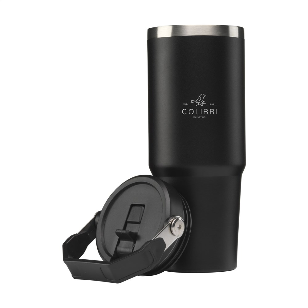 Grote, dubbelwandige drinkbeker van gerecycled RVS met rietje. De opvallende, stoere beker heeft een grote, draaibare handgreep en een schroefdeksel met een inklapbare drinktuit en een rietje. In deze enorme beker blijft drank voor lange tijd op temperatuur. Geschikt voor koude en warme dranken. Deze beker kan overal mee naartoe. Ideaal voor in de sportschool of op kantoor. Door de conische, smalle bodem past de beker in nagenoeg elke bekerhouder en is hij dus perfect voor onderweg. Niet vaatwasserbestendig. Totaal gerecycled materiaal: 73%. Inhoud 900 ml. Per stuk verpakt.