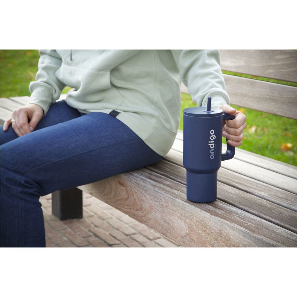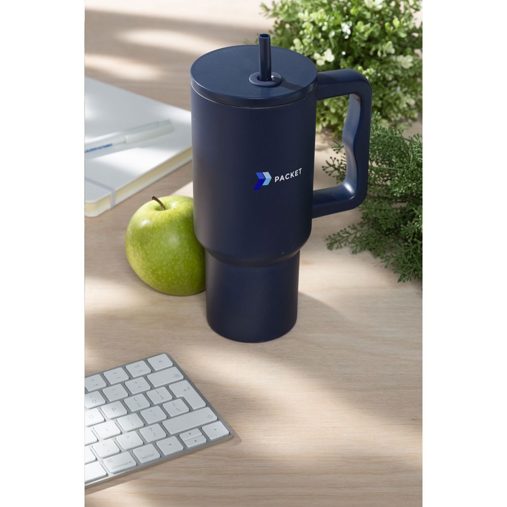 Grote, dubbelwandige drinkbeker van gerecycled RVS met rietje. De opvallende, stoere beker heeft een grote, kunststof handgreep en een schroefdeksel met een opening voor het meegeleverde, kunststof rietje. In deze enorme beker blijft drank voor langere tijd op temperatuur. Geschikt voor koude en warme dranken. Zonder rietje gaat de temperatuur niet verloren dankzij de siliconen afdichting in het deksel. Deze beker kan overal mee naartoe. Ideaal voor in de sportschool of op kantoor. Door de conische, smalle bodem past de beker in nagenoeg elke bekerhouder en is hij dus perfect voor onderweg. Niet vaatwasserbestendig. RCS-gecertificeerd. Totaal gerecycled materiaal: 75%. Inhoud 900 ml. Per stuk verpakt.