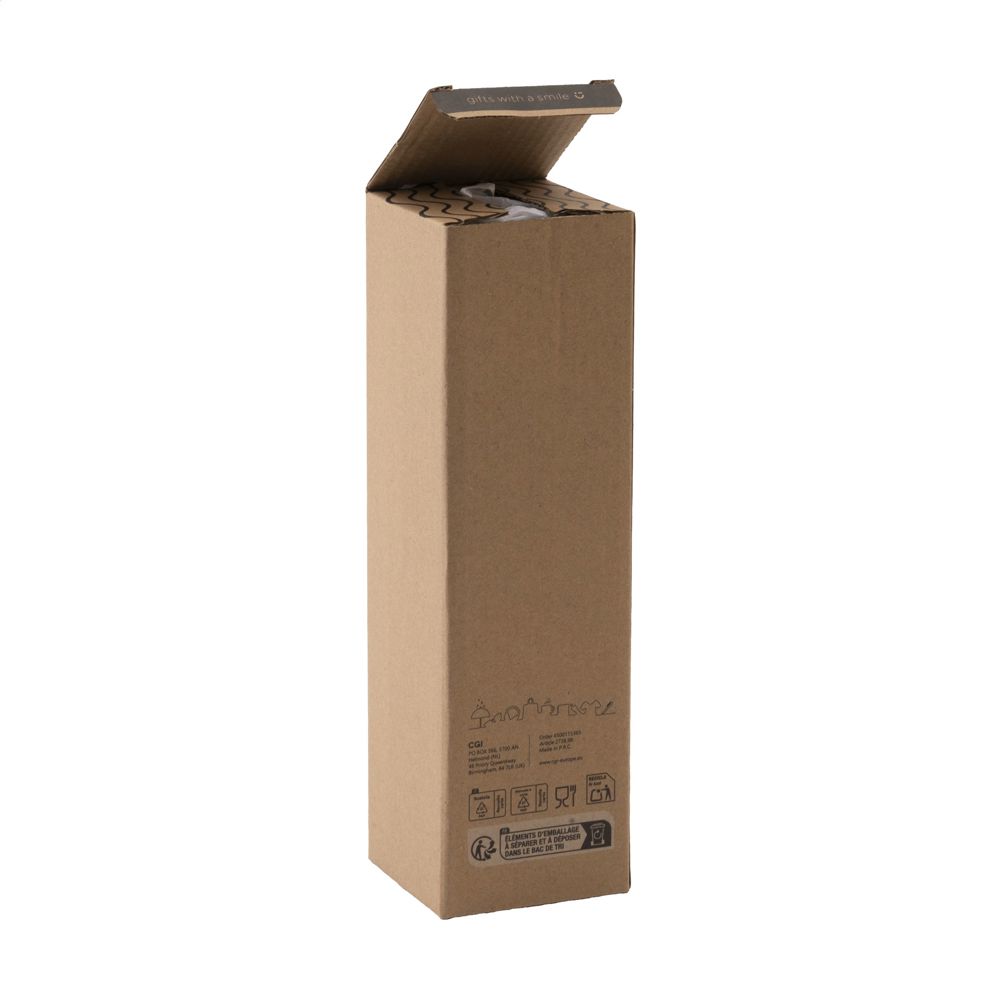 Slanke, lekvrije waterfles van sodalime-glas met RVS schroefdop. Met neopreen sleeve voor het comfortabel dragen van de fles. De glazen fles is vaatwasserbestendig m.u.v. de schroefdop. Inhoud 750 ml. Per stuk verpakt.
