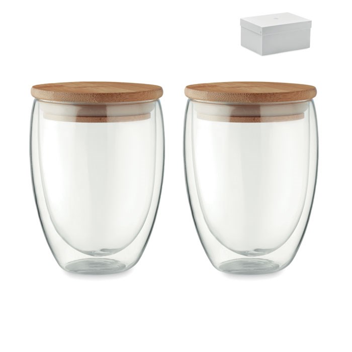 Set van dubbelwandige hoge borosilicaatglazen met bamboe deksel met siliconen ring. Inhoud 350 ml. Bamboe is een natuurlijk product, de kleur per artikel kan verschillen.