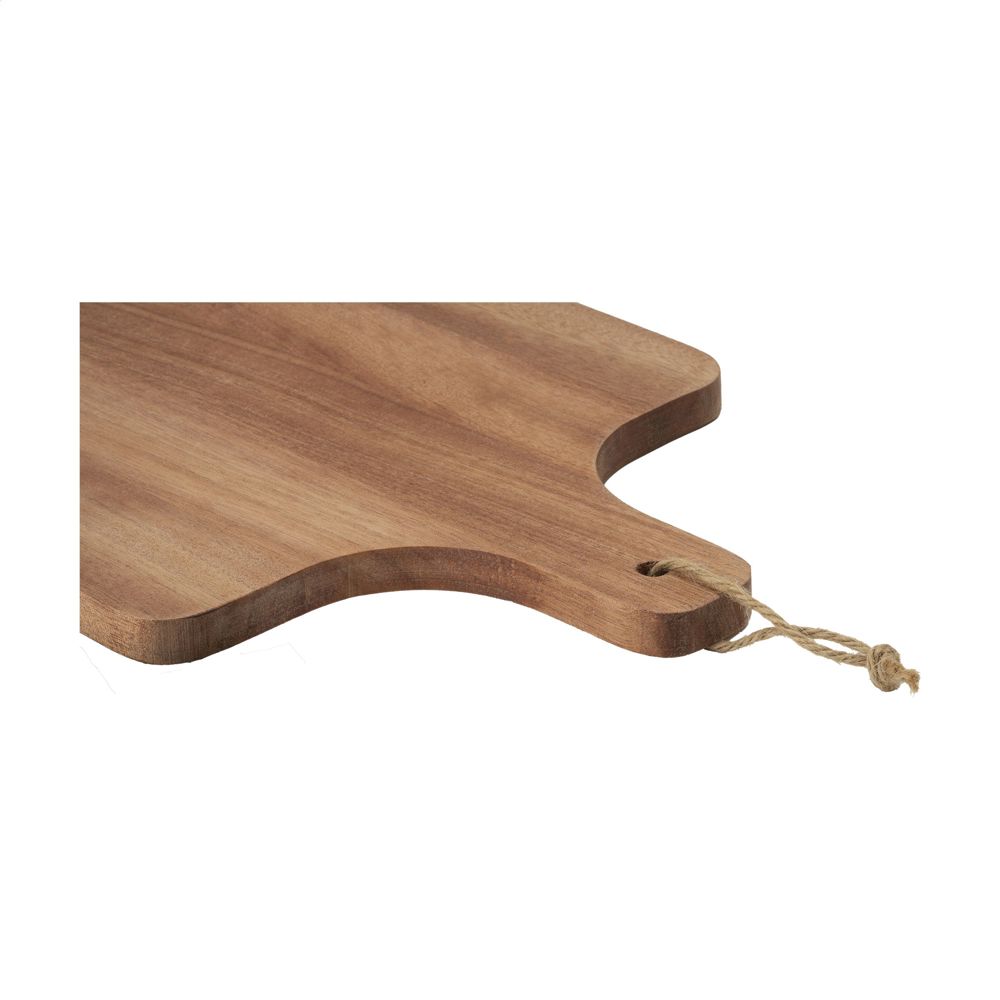 Prachtige, royale Wooosh serveerplank van FSC 100% gecertificeerd acaciahout, een robuuste houtsoort met een warme uitstraling. De fraaie kenmerken van acaciahout, zoals de fijne nerf, vlamtekeningen en wisselende kleurschakeringen, geven deze plank een uniek karakter. Deze plank is met zorg behandeld met een vegetarische sojabonenolie. Dankzij de bacteriedodende eigenschappen van acacia is deze plank van nature hygiënisch. De serveerplank is niet alleen functioneel, maar ook een decoratief pronkstuk. Het touwtje is praktisch en geeft extra karakter. De plank is groots in formaat en perfect voor het stijlvol presenteren van borrelhapjes of een smakelijke lunch. Laat deze prachtige plank een onmisbaar onderdeel worden van jouw culinaire beleving. Per stuk in een luxe Wooosh geschenkverpakking.