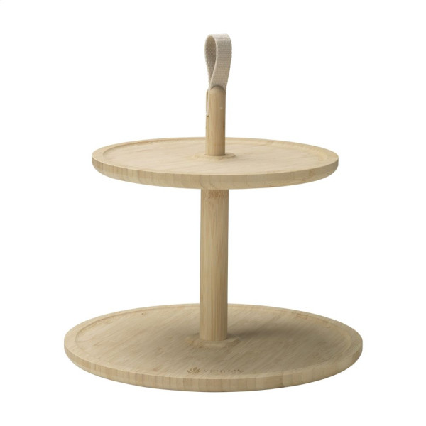 Tweedelige étagère van Rackpack. Met twee plateaus en een centrale pin van FSC 100% gecertificeerd bamboe. De handige draaglus is van canvas. Deze mooi afgewerkte étagère tilt elke snack naar een hoger niveau. Een blikvanger op tafel tijdens een brunch, high tea of borrelmomenten. Eenvoudig te monteren en demonteren, dus ook gemakkelijk plat op te bergen. Bamboe is een natuurlijk materiaal. Hierdoor kan de kleur per product variëren. Per stuk verpakt.