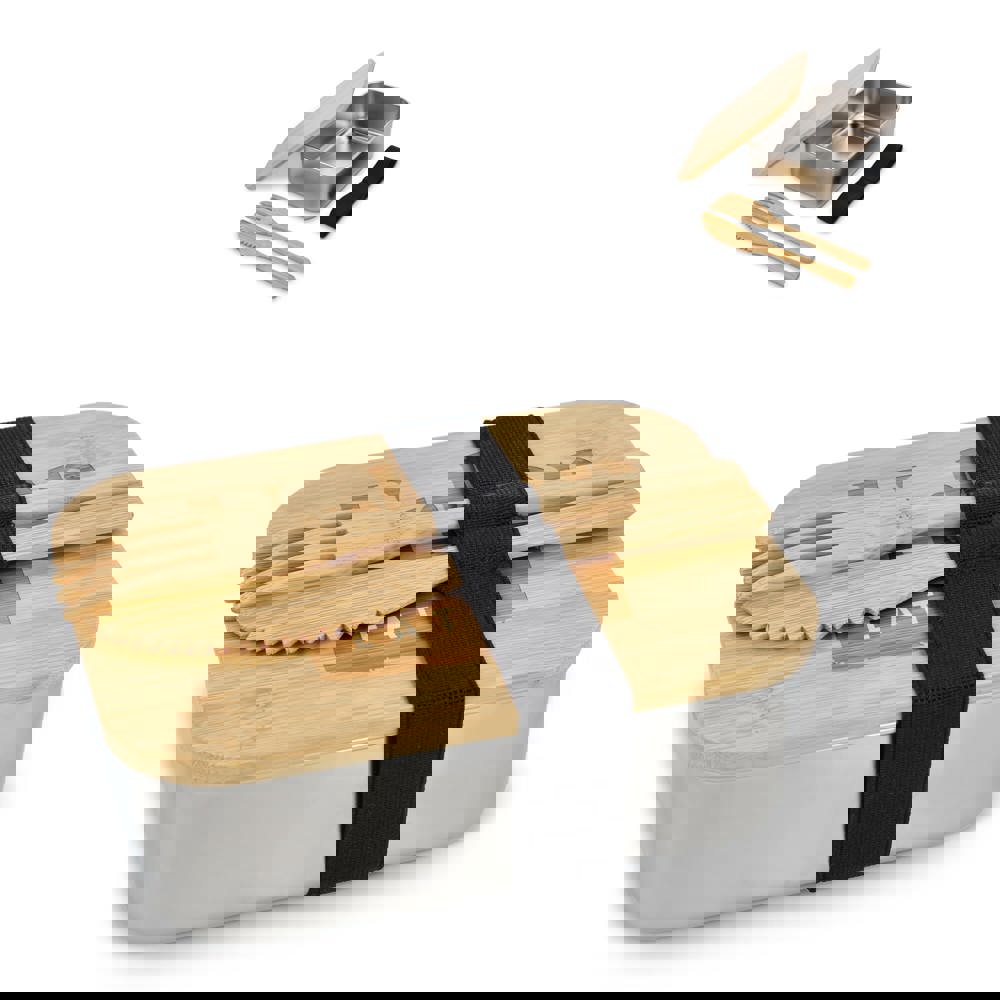 RVS lunchbox met bamboe deksel. Afgesloten met een elastische band waarin je ook de bamboo mes en vork bevestigd. Individueel verpakt in een geschenkdoos.