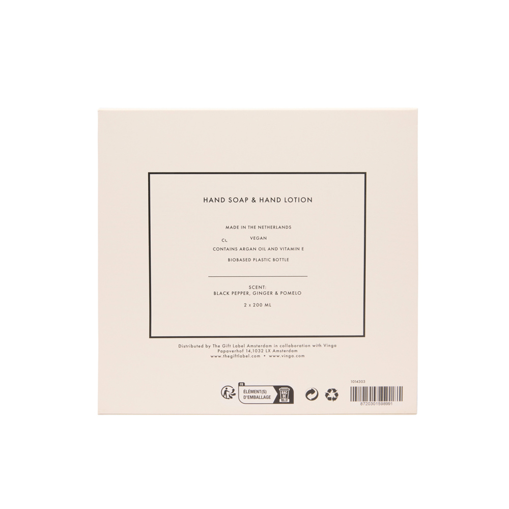 Zijdezachte handen, elke dag. Verzorg je handen met deze heerlijk geurende unisex set, bestaande uit twee flacons van 200 ml: handzeep en handlotion. Met de warme, pittige geur van zwarte peper, gember en pomelo laat deze set je handen zacht, gevoed en subtiel geparfumeerd aanvoelen. Een aanraking die mensen zullen onthouden. Elegant verpakt in een geschenkdoos in crème-wit en zwart.