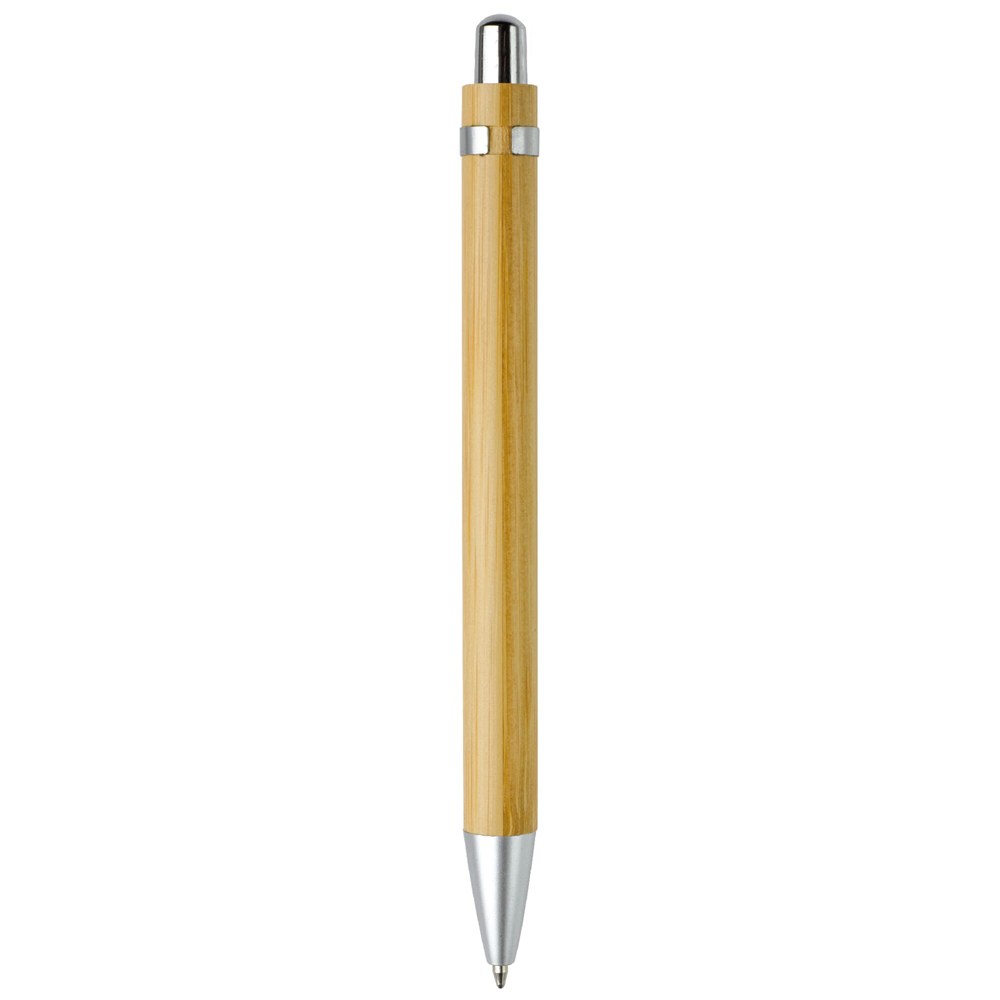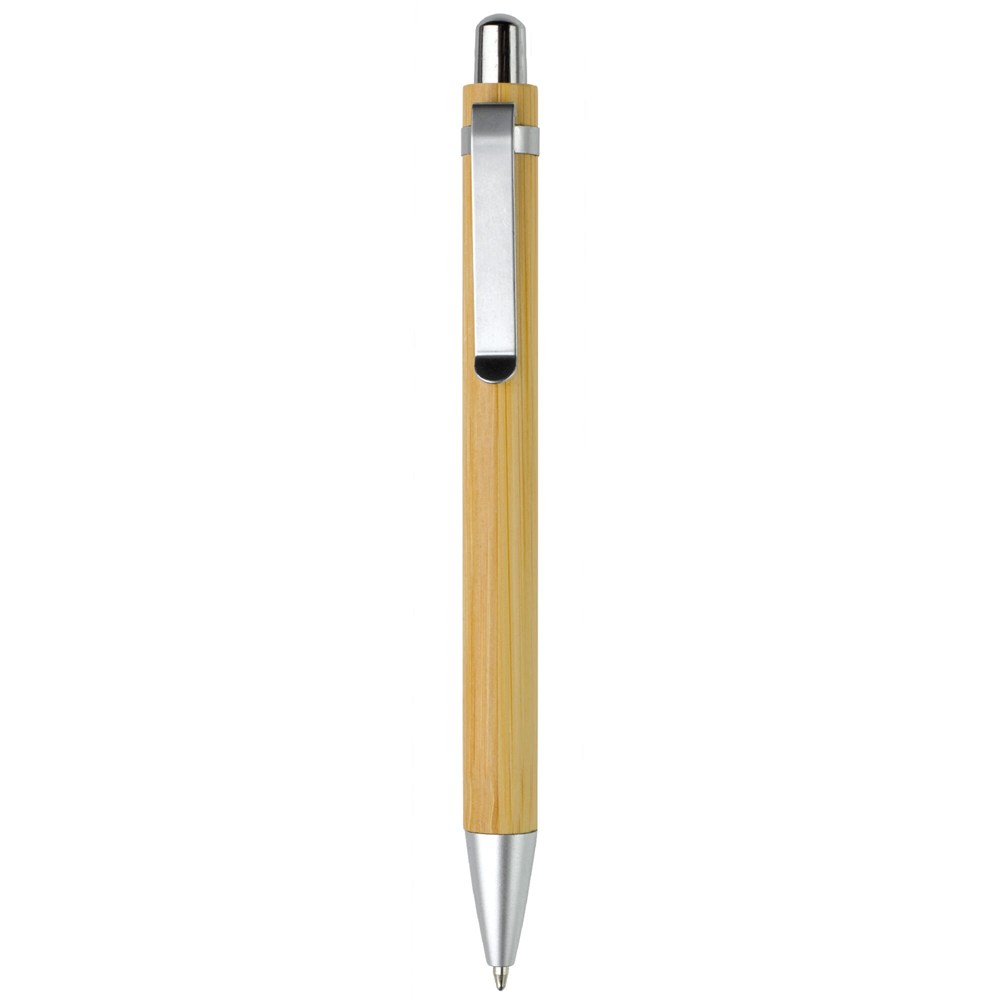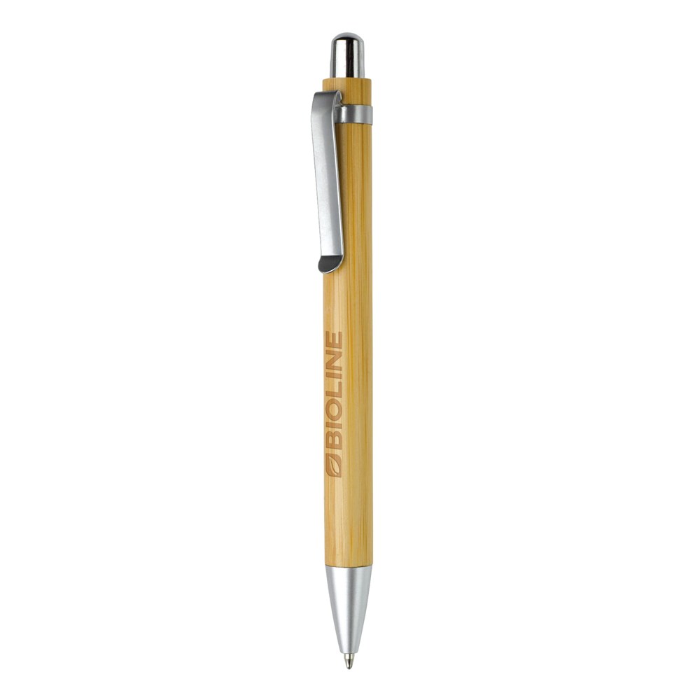 Balpen van bamboe materiaal met metalen clip en gemetaliseerde drukker en punt. De pen bevat een blauwschrijvende Jumbo vulling.