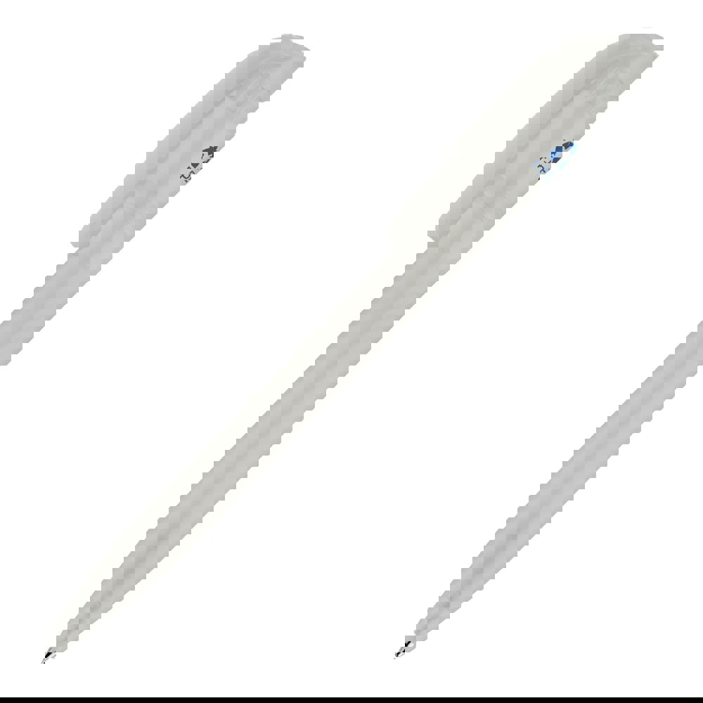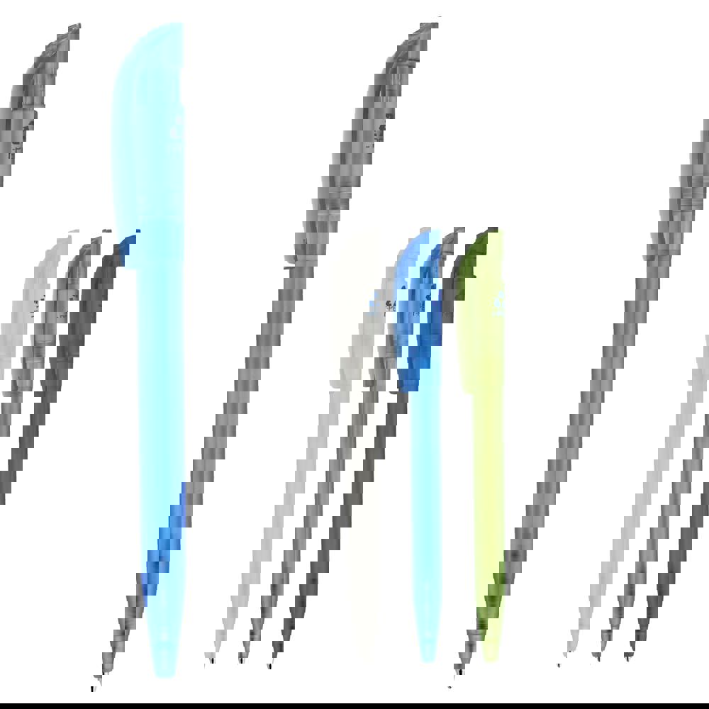 Moderne transparante balpen met boogclip, gemaakt van R-PET materiaal. R-PET betekend gerecycled PET kunststof. Door het grote drukoppervlak is het een uitstekend promotie artikel. Het bevat een drukmechaniek en een X20 vulling met blauw schrijvende inkt.