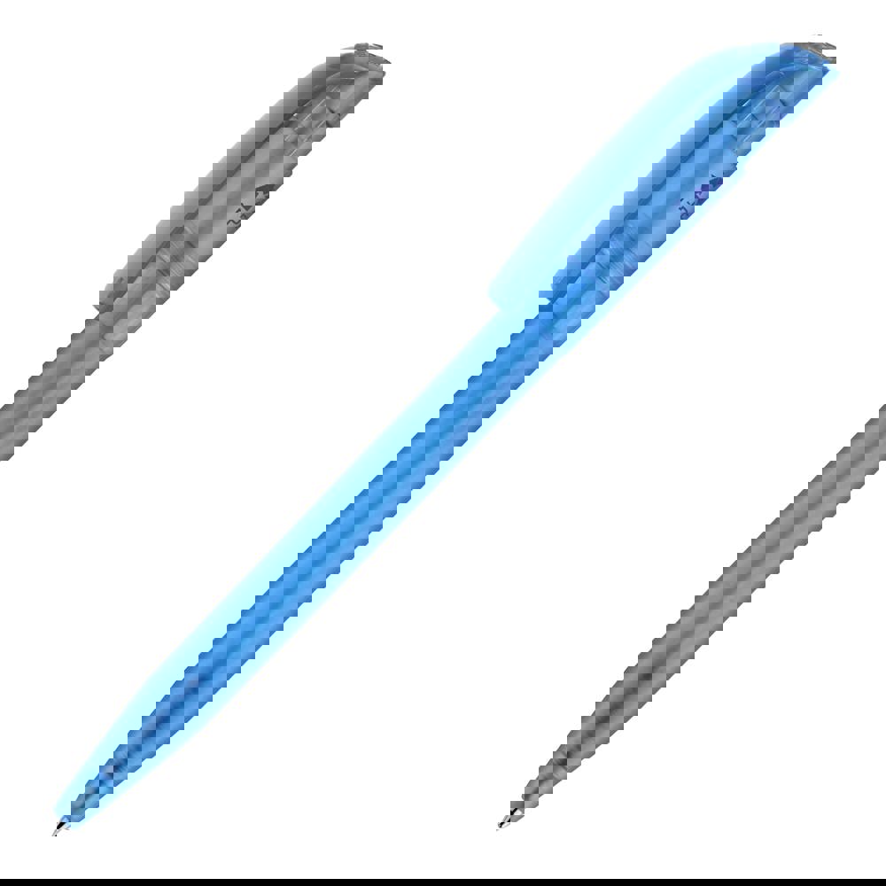 Moderne transparante balpen met boogclip, gemaakt van R-PET materiaal. R-PET betekend gerecycled PET kunststof. Door het grote drukoppervlak is het een uitstekend promotie artikel. Het bevat een drukmechaniek en een X20 vulling met blauw schrijvende inkt.