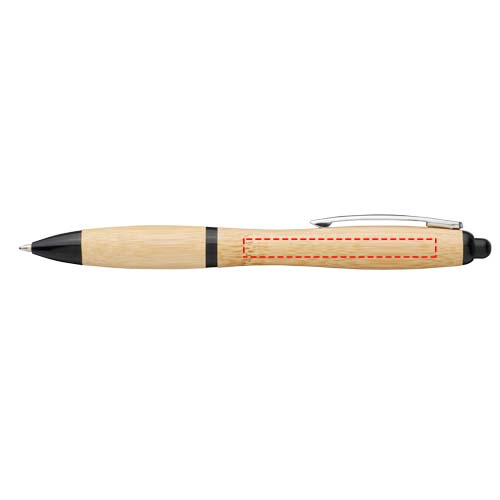 Balpen met klikmechanisme, met een huls van bamboe, geaccentueerd door een verchroomde clip en ABS kunststof sierranden. De kleur van het bamboemateriaal kan variëren.