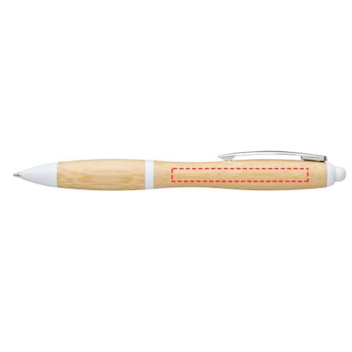 Balpen met klikmechanisme, met een huls van bamboe, geaccentueerd door een verchroomde clip en ABS kunststof sierranden. De kleur van het bamboemateriaal kan variëren.