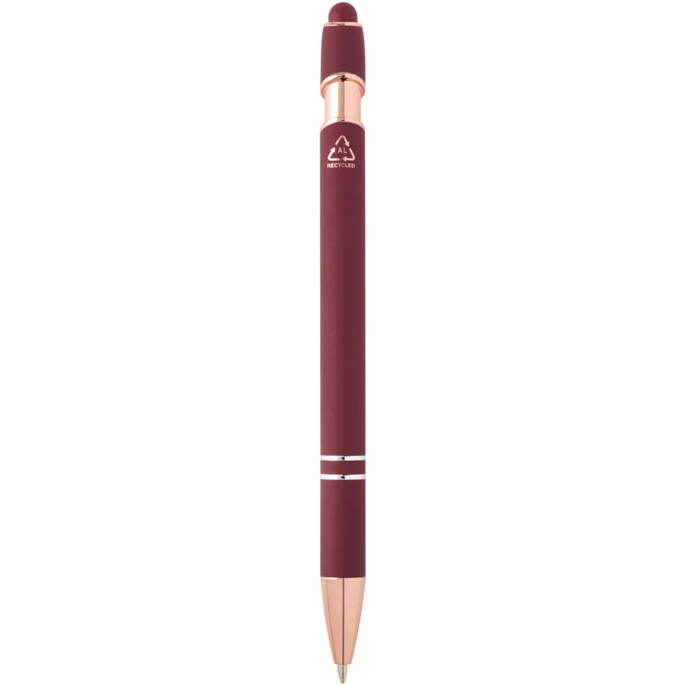 De Nanna balpen met roségouden afwerking heeft een houder van gerecycled aluminium met een siliconen touch stylus. Gerecycled aluminium vermindert de hoeveelheid afval op stortplaatsen en draagt bij aan het behoud van natuurlijke hulpbronnen, met als doel de uitstoot van broeikasgassen te verminderen. Inktkleur: zwart. Schrijflengte: 800 meter. Stiftmaat: 1,0 mm.