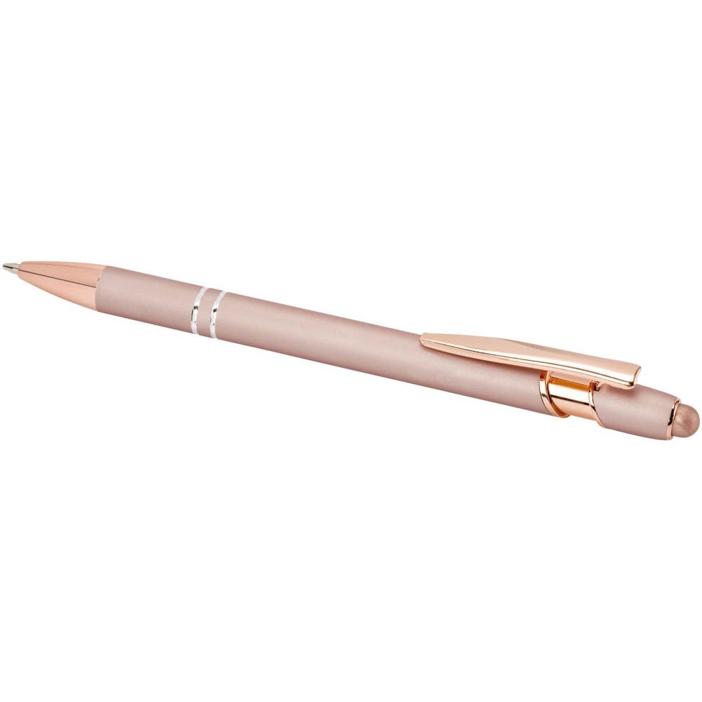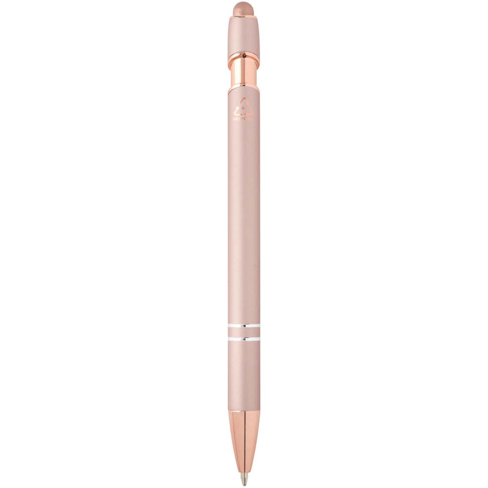 De Nanna balpen met roségouden afwerking heeft een houder van gerecycled aluminium met een siliconen touch stylus. Gerecycled aluminium vermindert de hoeveelheid afval op stortplaatsen en draagt bij aan het behoud van natuurlijke hulpbronnen, met als doel de uitstoot van broeikasgassen te verminderen. Inktkleur: zwart. Schrijflengte: 800 meter. Stiftmaat: 1,0 mm.