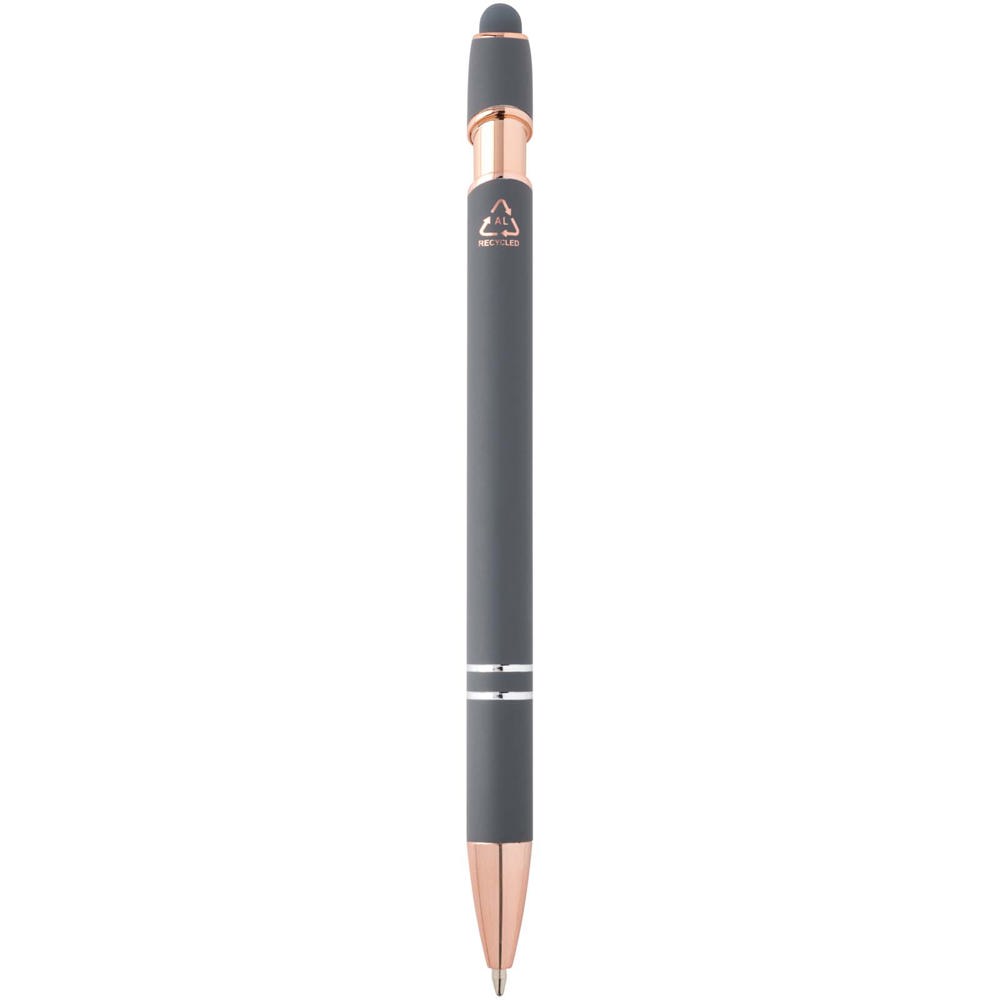 De Nanna balpen met roségouden afwerking heeft een houder van gerecycled aluminium met een siliconen touch stylus. Gerecycled aluminium vermindert de hoeveelheid afval op stortplaatsen en draagt bij aan het behoud van natuurlijke hulpbronnen, met als doel de uitstoot van broeikasgassen te verminderen. Inktkleur: zwart. Schrijflengte: 800 meter. Stiftmaat: 1,0 mm.