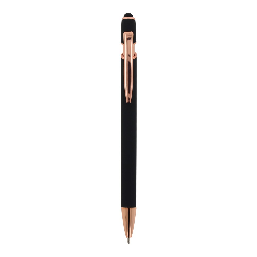 Rose Gold aluminium balpen met elegante soft-touch afwerking en stylus. Met een solide metalen clip. Schrijfkleur: blauw.