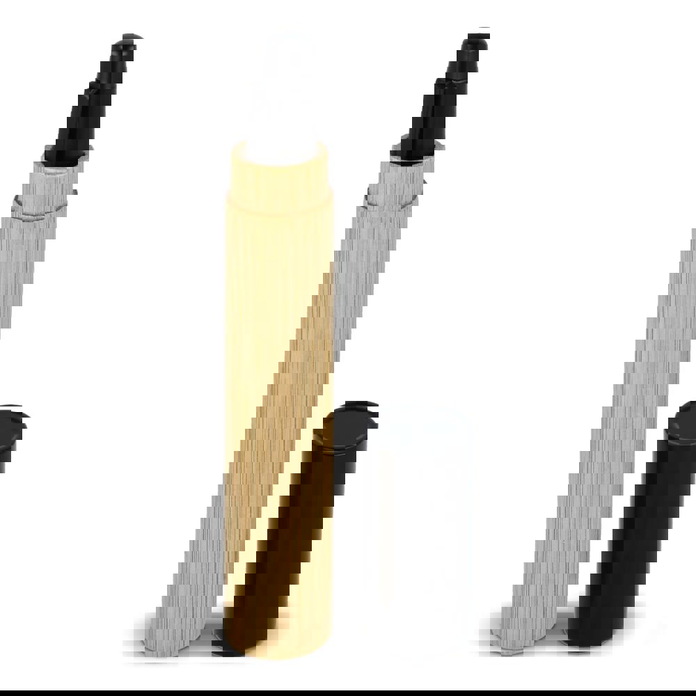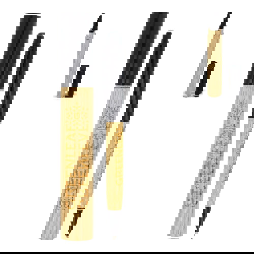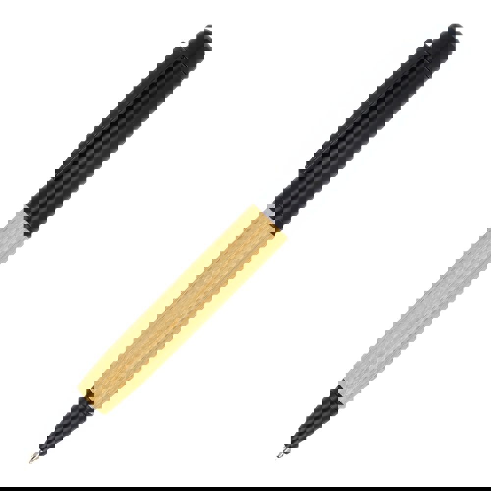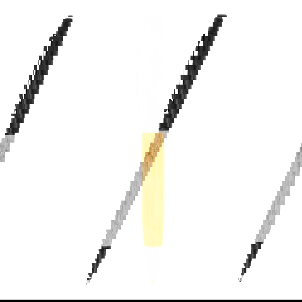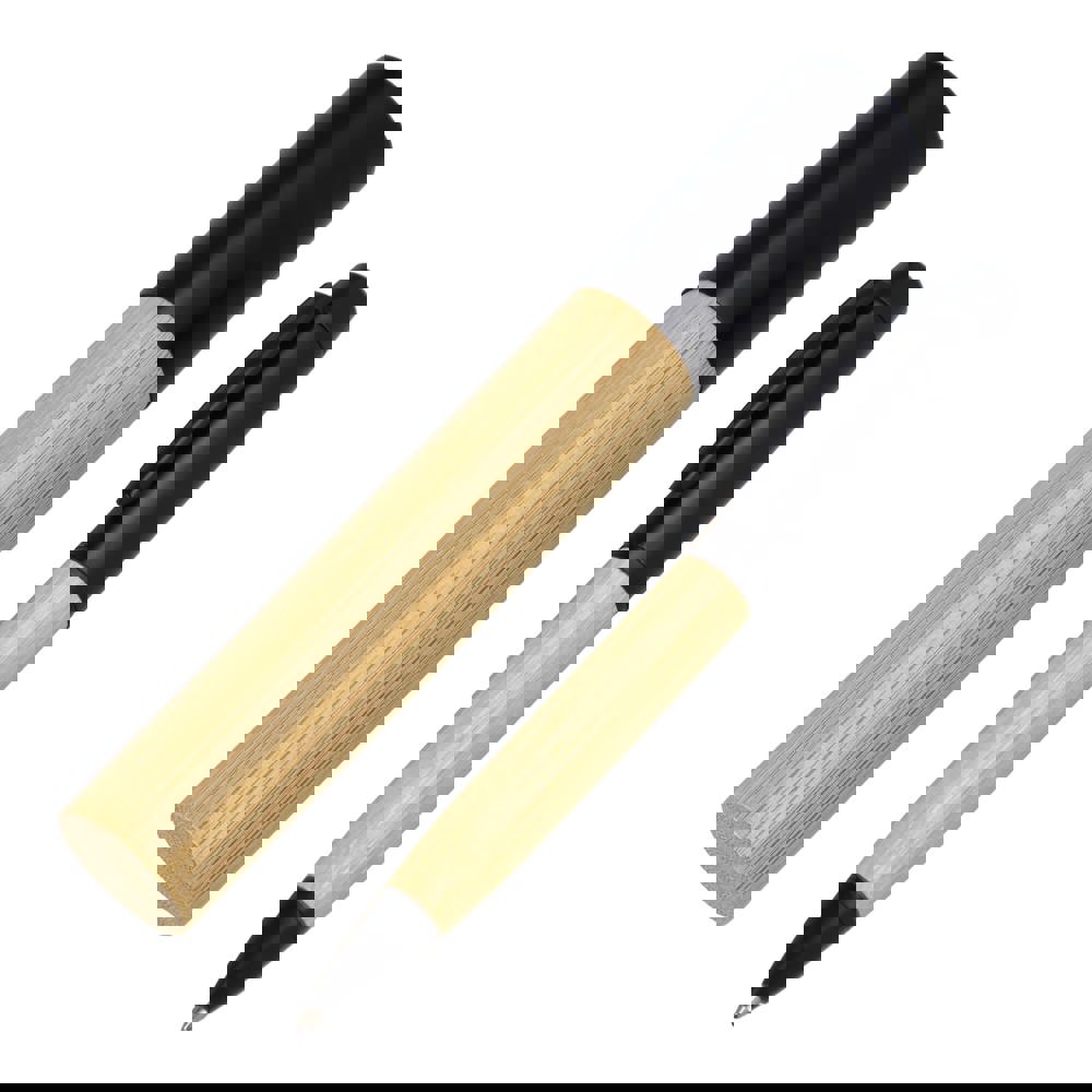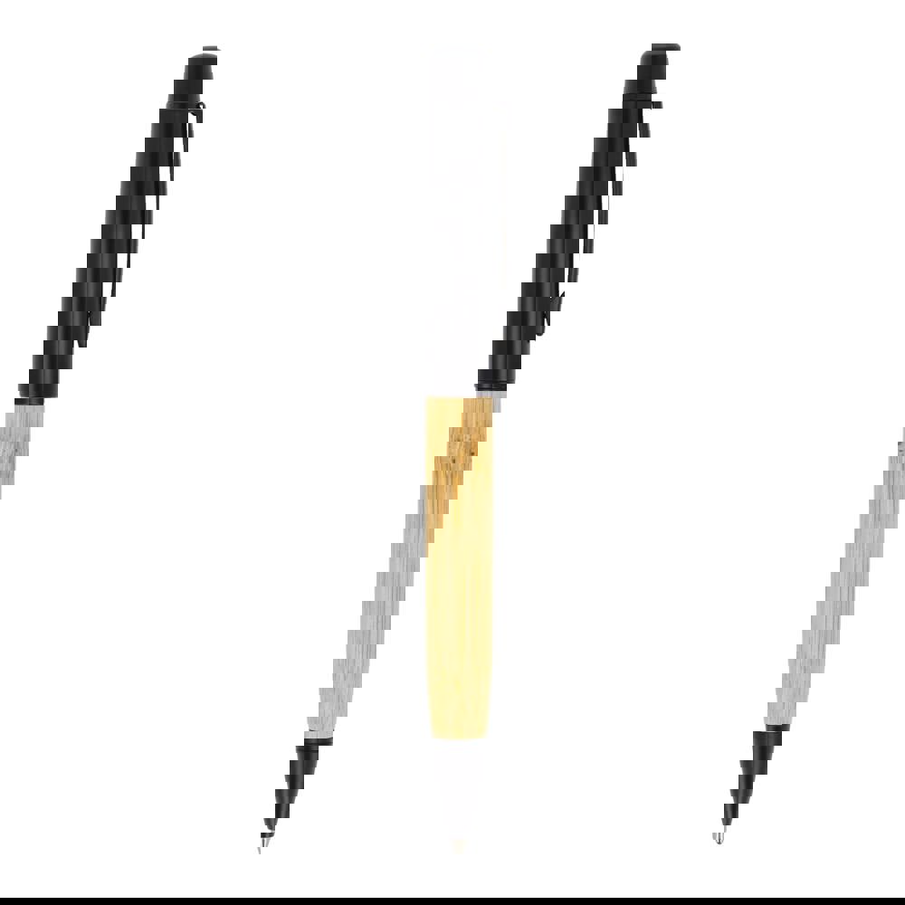 Metalen balpen met zwarte metalen details en een bamboe houder, elegant gepresenteerd in een...meer