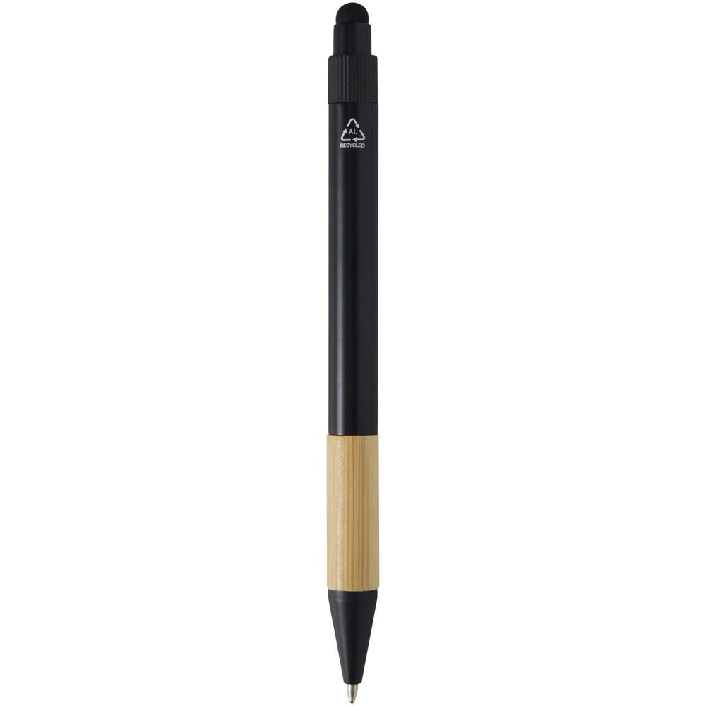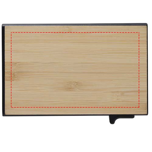 De Minka geschenkset bevat een RCS-gecertificeerde balpen van gerecycled aluminium met een stijlvolle bamboe grip en styluspunt, een aluminium sleutelhanger (5,5 × 1,8 × 1 cm) met bamboe details en geïntegreerde telefoonhouder, en een RFID-kaarthouder (9,7 × 6,2 × 1 cm) van aluminiumlegering met bamboe accenten, geschikt voor maximaal 10 kaarten. De balpen schrijft met zwarte inkt en heeft een schrijfbereik van 1000 meter. Geleverd in een luxe zwarte geschenkverpakking (16 × 16 × 2,7 cm) die ideaal is voor logobedrukking.