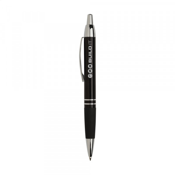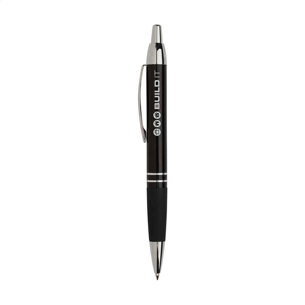 Blauwschrijvende, metalen balpen met hoogglans metallic look houder, gripvast, rubberen voorstuk, stevige, metalen clip en drukknop en zilverkleurige hoogglans accenten.