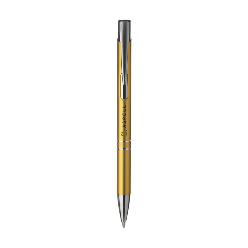 Blauwschrijvende óf zwartschrijvende, aluminium balpen met matgekleurde houder in metallic look en metalen clip.