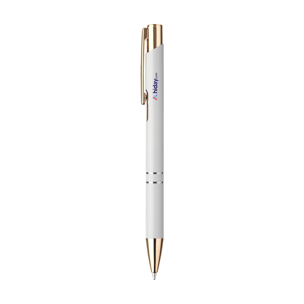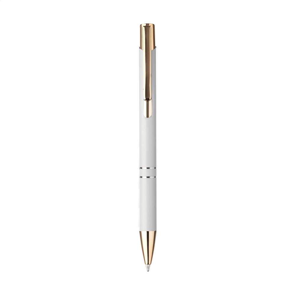 Blauwschrijvende balpen van gerecycled aluminium met een stevige, roségouden clip/drukknop van gerecycled aluminium. De pen heeft elegante roségouden en zilverkleurige accenten en is daarmee een opvallend chique verschijning. RCS-gecertificeerd. Totaal gerecycled materiaal: 94%. Door het gebruik van gerecycled aluminium worden er minder nieuwe grondstoffen gebruikt tijdens de productie van dit product. Dit betekent minder energieverbruik en minder gebruik van water.