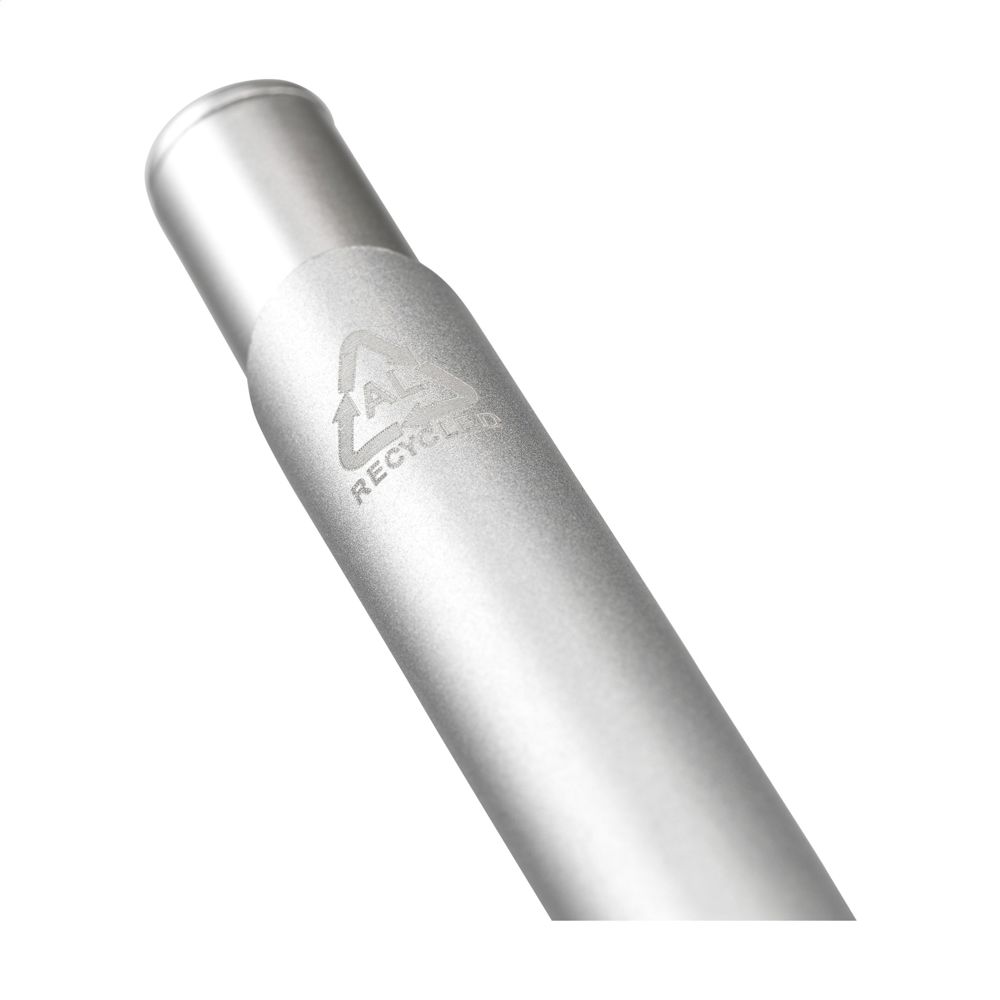 Blauwschrijvende balpen met een houder van 100%% gerecycled aluminium. Met stevige metalen clip en een kunststof puntstuk en drukknop. RCS-gecertificeerd. Door het gebruik van gerecycled aluminium worden er minder nieuwe grondstoffen gebruikt tijdens de productie van dit product. Dit betekent minder energieverbruik en minder gebruik van water.