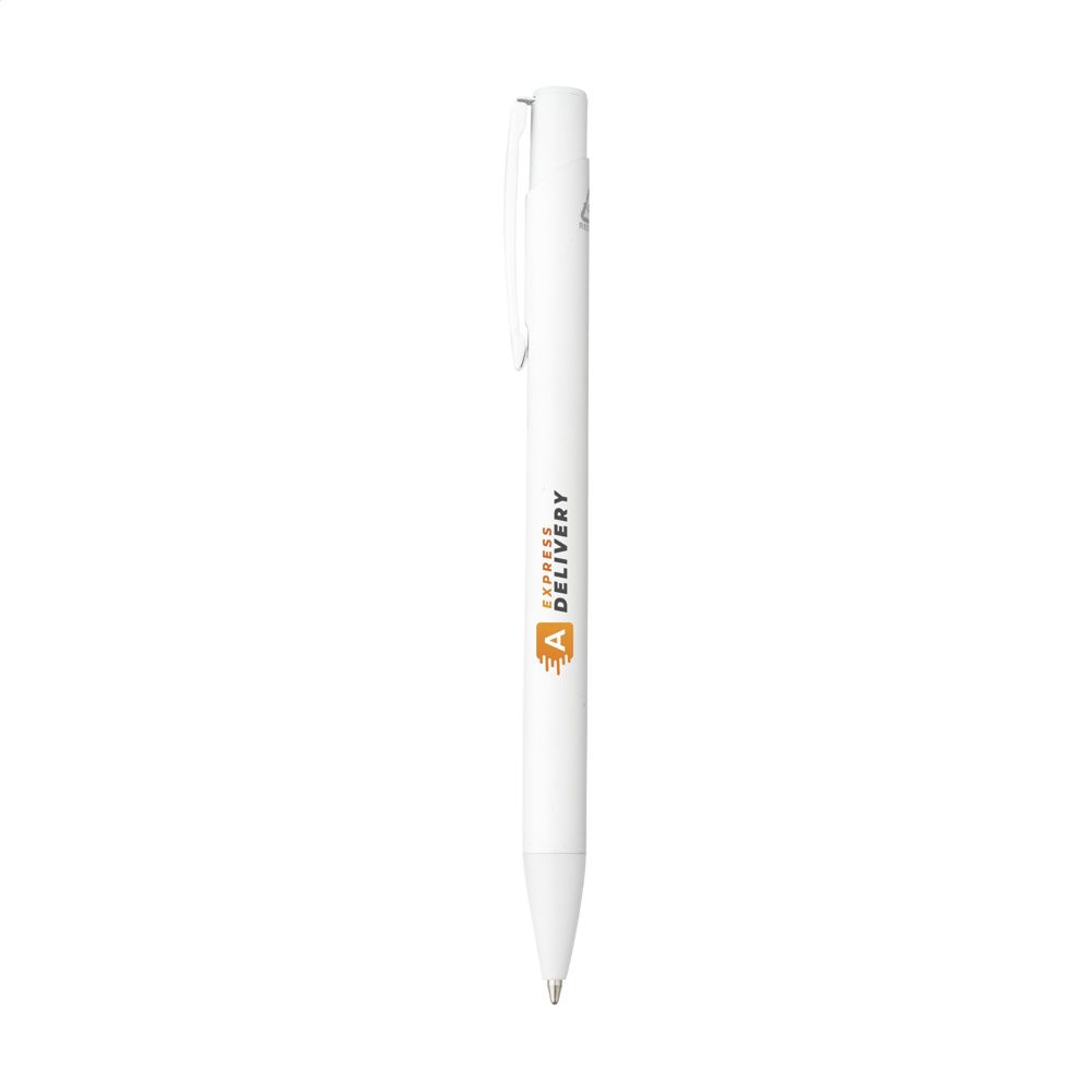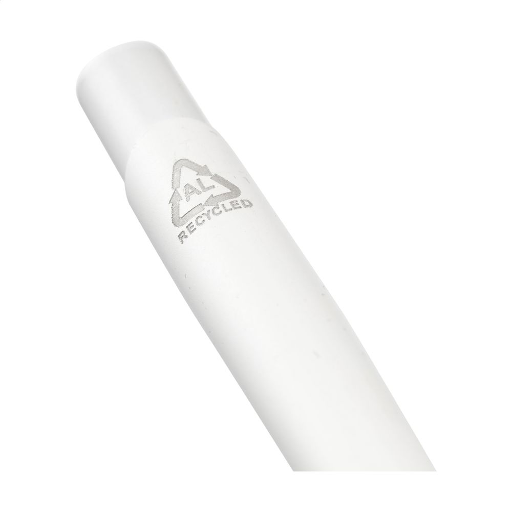 Blauwschrijvende balpen met een houder van 100%% gerecycled aluminium. Met stevige metalen clip en een kunststof puntstuk en drukknop. RCS-gecertificeerd. Door het gebruik van gerecycled aluminium worden er minder nieuwe grondstoffen gebruikt tijdens de productie van dit product. Dit betekent minder energieverbruik en minder gebruik van water.