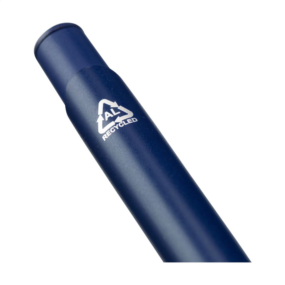Blauwschrijvende balpen met een houder van 100%% gerecycled aluminium. Met stevige metalen clip en een kunststof puntstuk en drukknop. RCS-gecertificeerd. Door het gebruik van gerecycled aluminium worden er minder nieuwe grondstoffen gebruikt tijdens de productie van dit product. Dit betekent minder energieverbruik en minder gebruik van water.