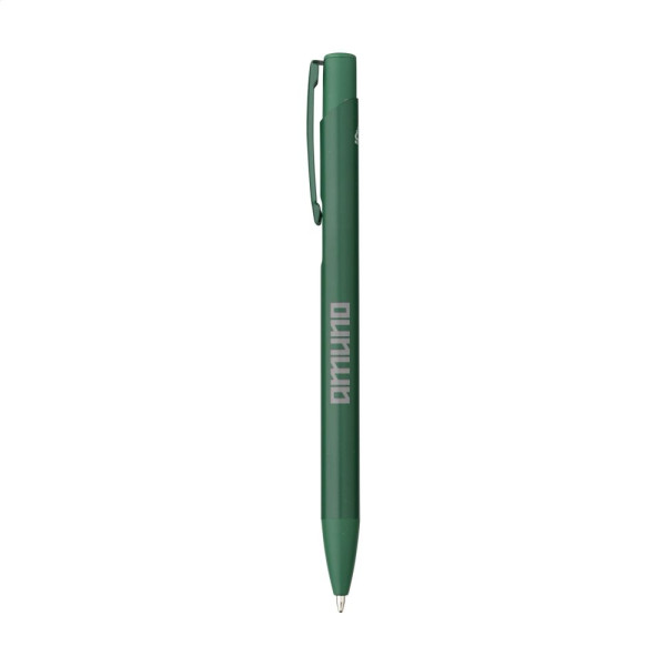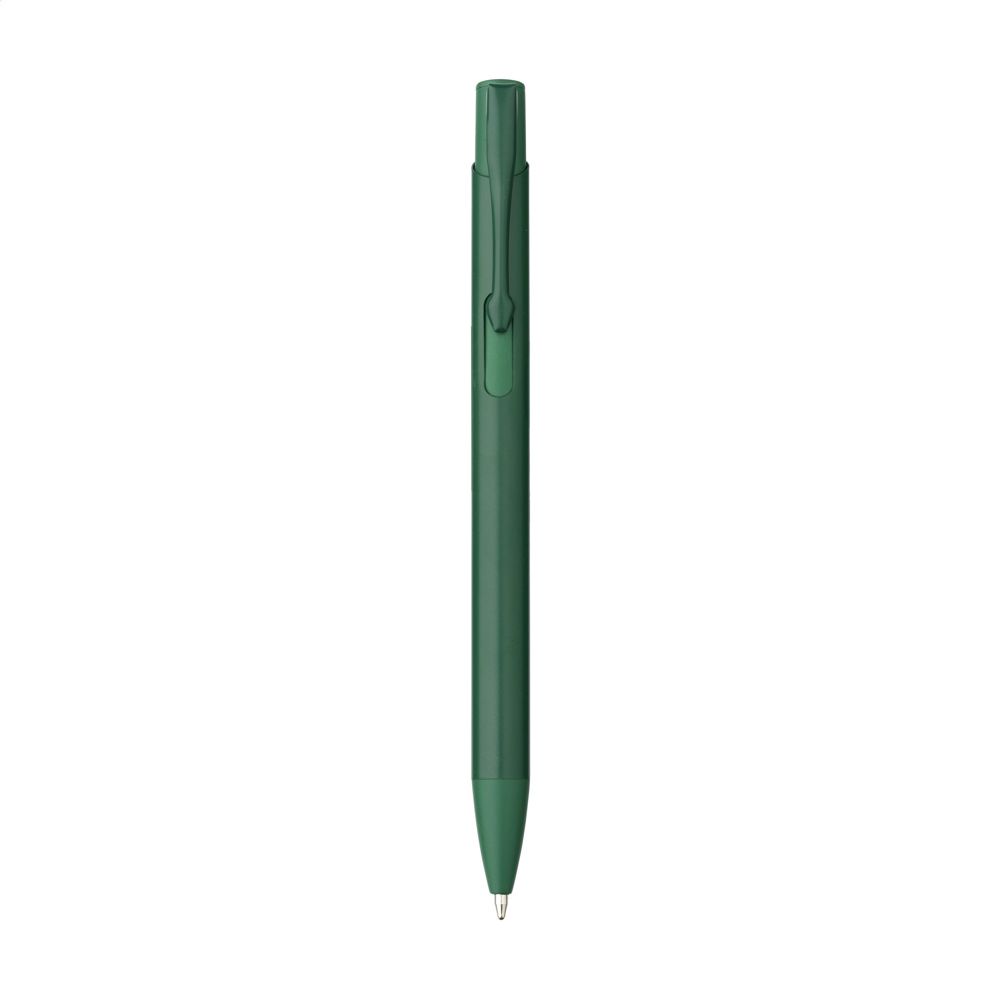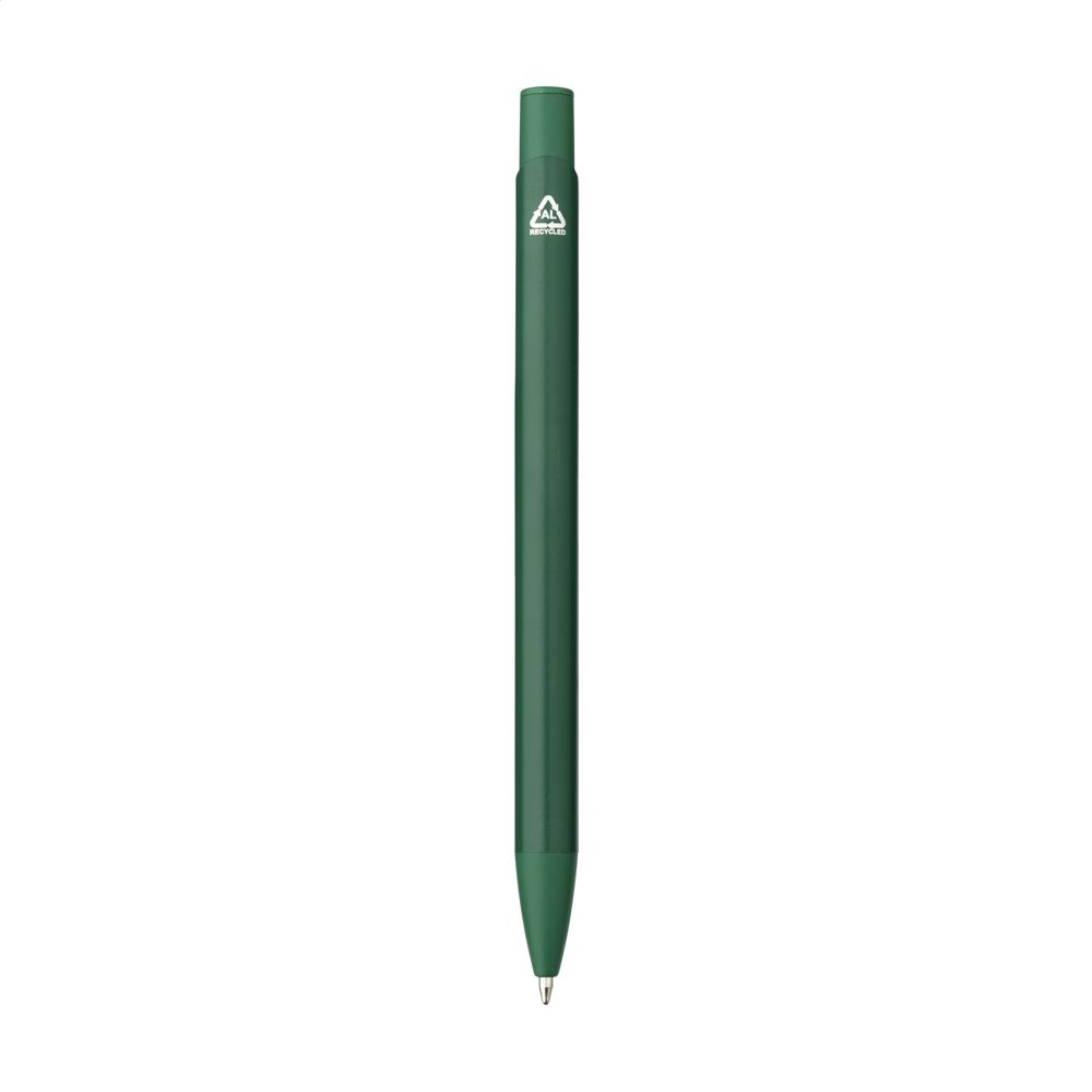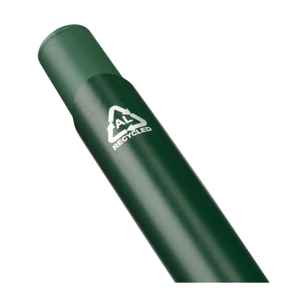 Blauwschrijvende balpen met een houder van 100%% gerecycled aluminium. Met stevige metalen clip en een kunststof puntstuk en drukknop. RCS-gecertificeerd. Door het gebruik van gerecycled aluminium worden er minder nieuwe grondstoffen gebruikt tijdens de productie van dit product. Dit betekent minder energieverbruik en minder gebruik van water.