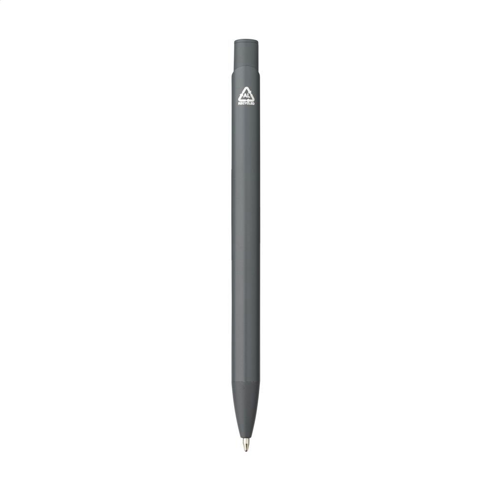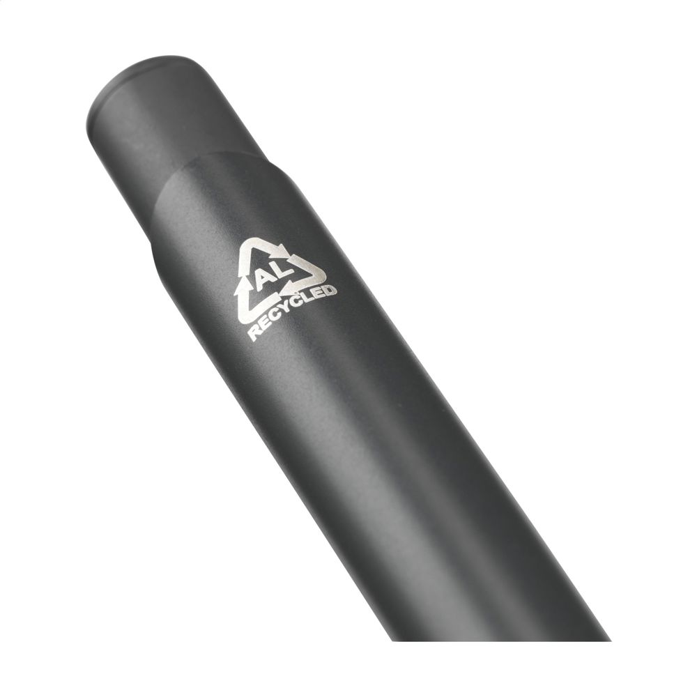 Blauwschrijvende balpen met een houder van 100%% gerecycled aluminium. Met stevige metalen clip en een kunststof puntstuk en drukknop. RCS-gecertificeerd. Door het gebruik van gerecycled aluminium worden er minder nieuwe grondstoffen gebruikt tijdens de productie van dit product. Dit betekent minder energieverbruik en minder gebruik van water.