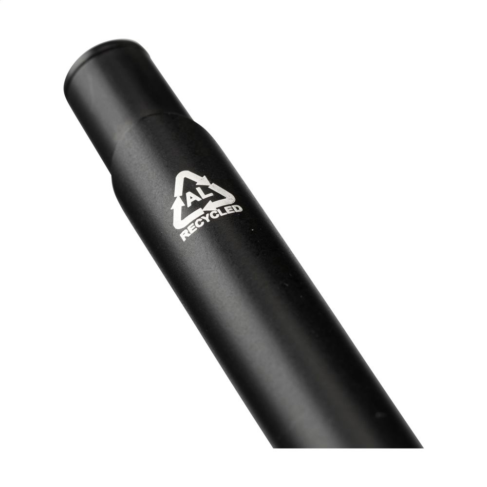 Blauwschrijvende balpen met een houder van 100%% gerecycled aluminium. Met stevige metalen clip en een kunststof puntstuk en drukknop. RCS-gecertificeerd. Door het gebruik van gerecycled aluminium worden er minder nieuwe grondstoffen gebruikt tijdens de productie van dit product. Dit betekent minder energieverbruik en minder gebruik van water.