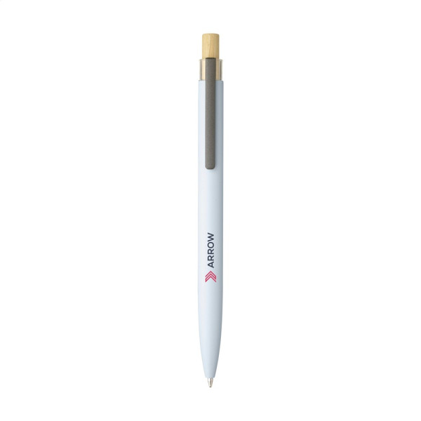 Modieuze, blauwschrijvende balpen met een houder van 100% gerecycled aluminium, afgewerkt met een matte finish. De bamboe drukknop heeft een transparant accent. De houder bestaat uit één geheel en is standaard bedrukt met het 'recycled aluminium logo'. GRS-gecertificeerd. Door het gebruik van gerecycled aluminium worden er minder nieuwe grondstoffen gebruikt tijdens de productie van dit product. Dit betekent minder energieverbruik en minder gebruik van water.