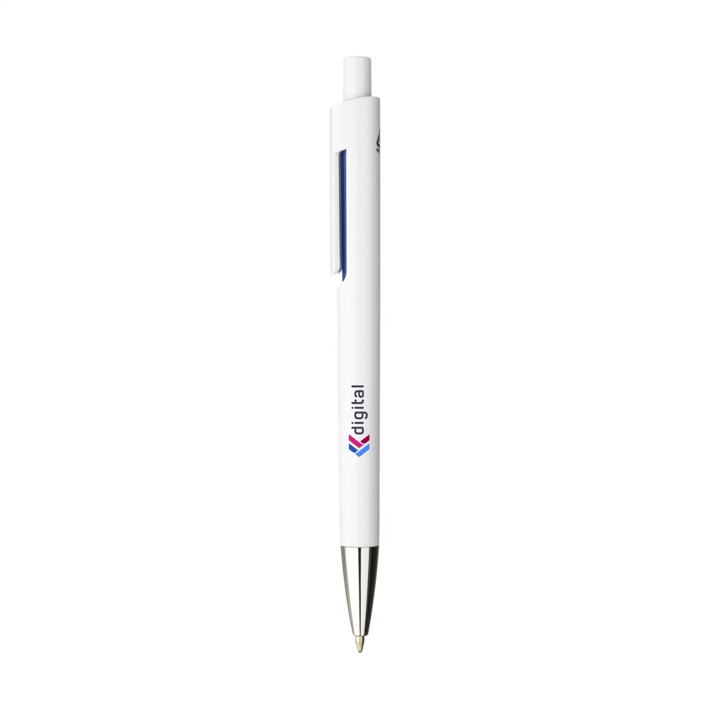 Blauwschrijvende balpen met een houder van 100% gerecycled ABS. Met uniek design: de body en clip van deze balpen zijn uit één geheel vormgegeven en dat maakt deze pen tot een bijzondere eyecatcher. Met opvallend kleuraccent onder de optisch 'zwevende' clip. GRS-gecertificeerd.