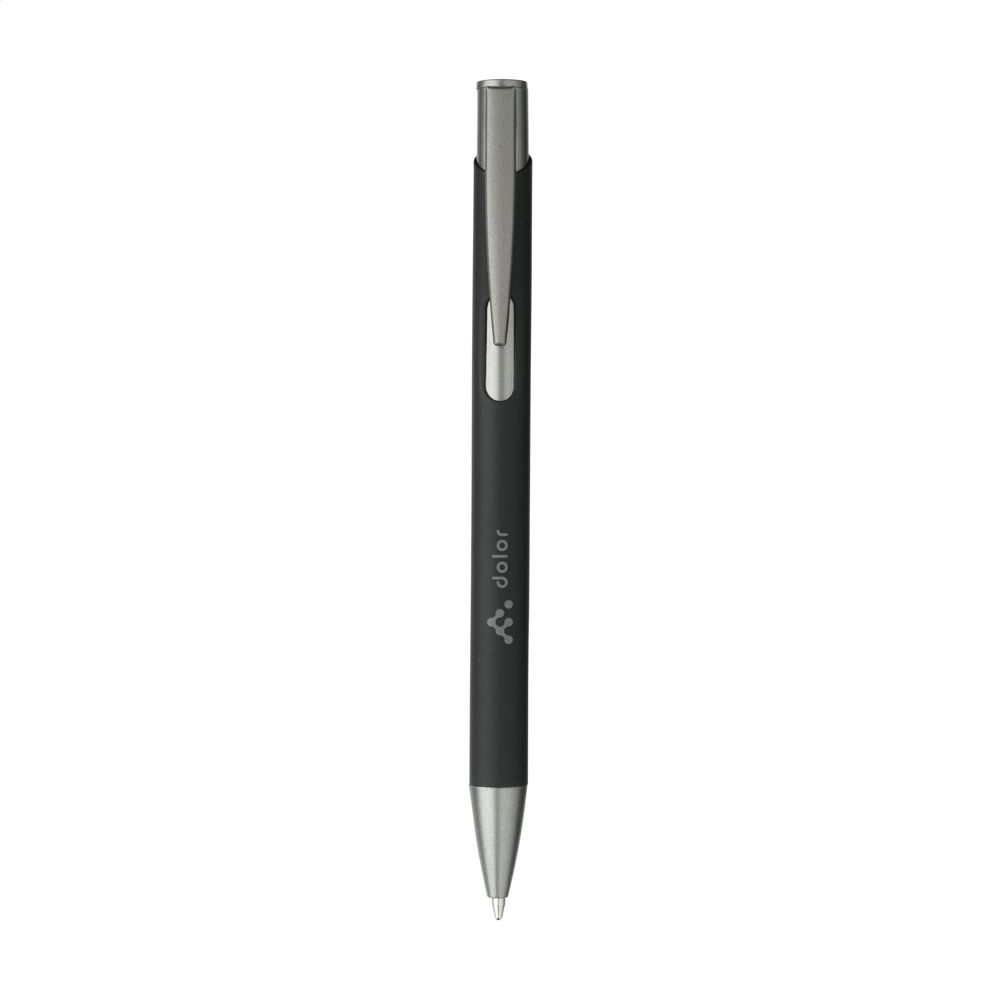 Blauwschrijvende balpen met een houder van gerecycled aluminium. De houder is voorzien van een rubberised soft touch finish. Met stevige metalen clip/drukknop en kunststof puntstuk. Met metalen clip/drukknop. RCS-gecertificeerd. Totaal gerecycled materiaal: 94%. Door het gebruik van gerecycled aluminium worden er minder nieuwe grondstoffen gebruikt tijdens de productie van dit product. Dit betekent minder energieverbruik en minder gebruik van water.