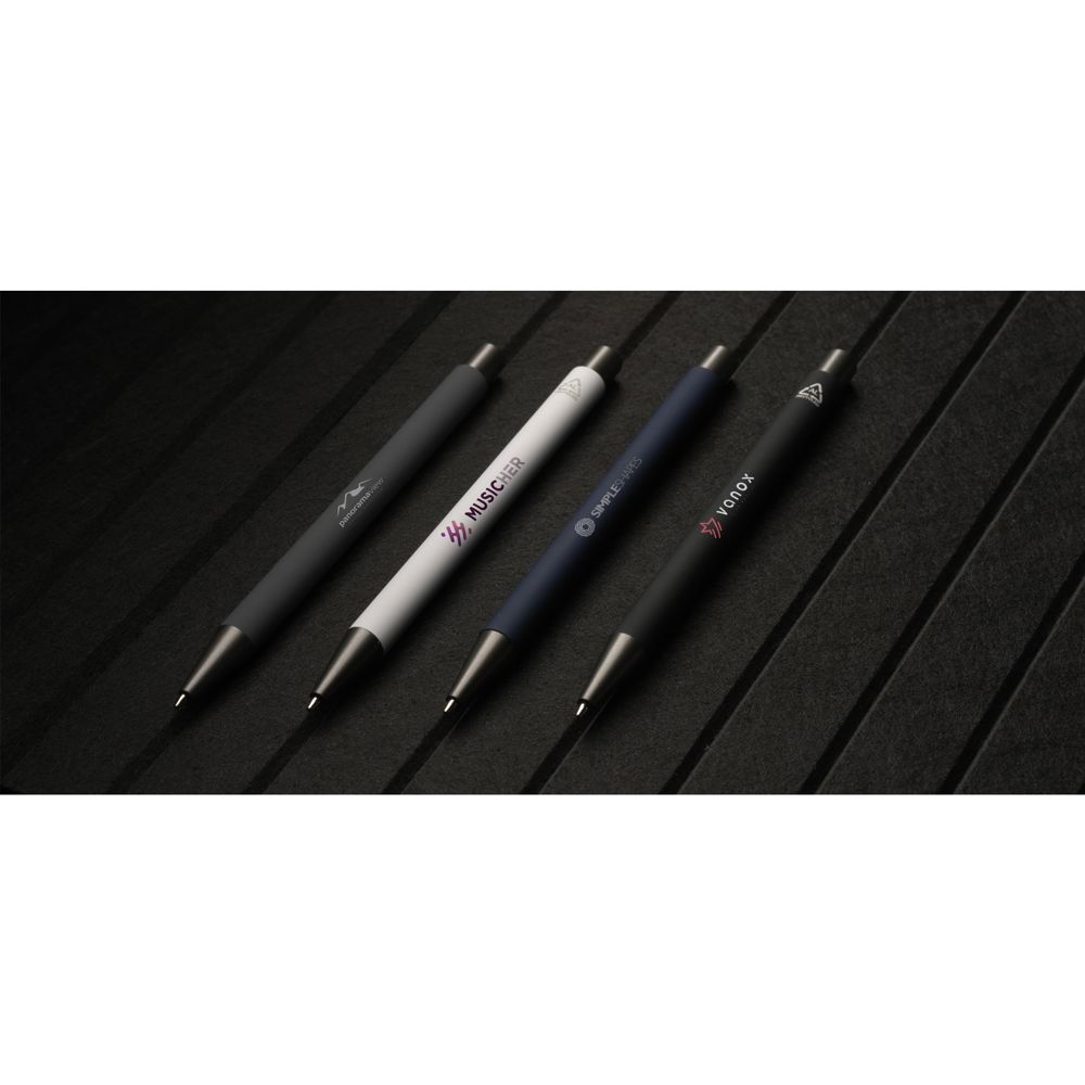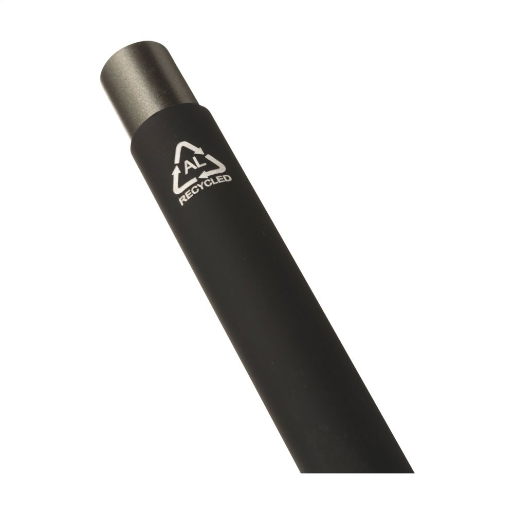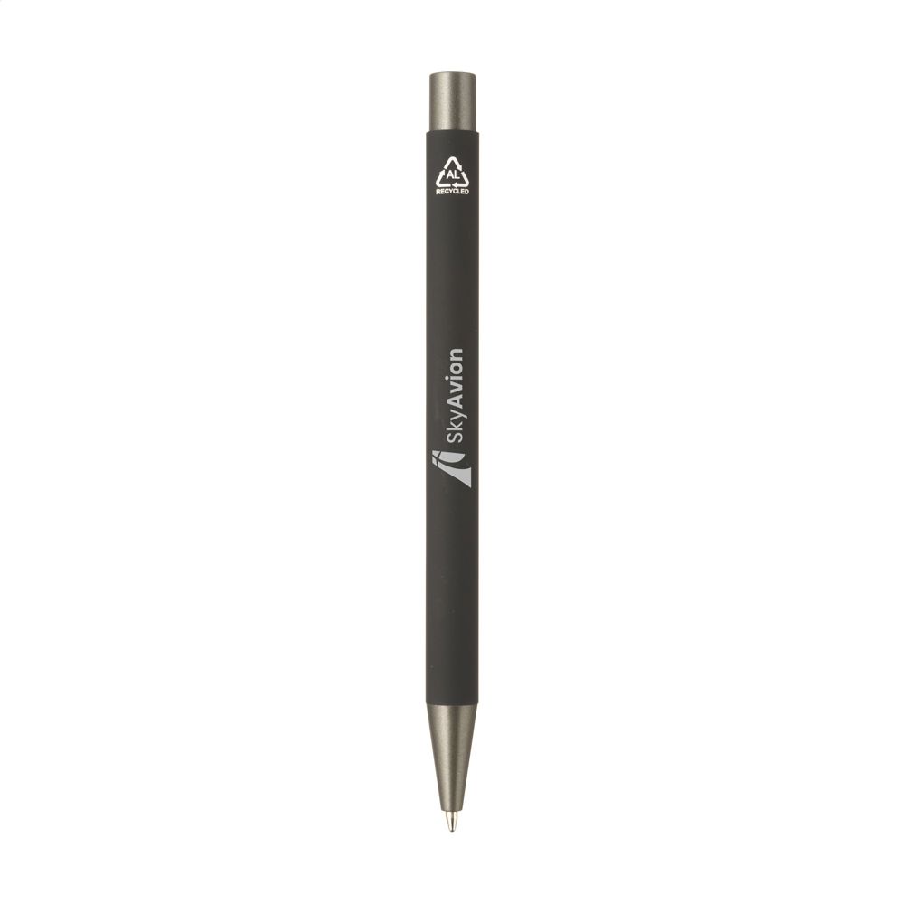 Blauwschrijvende balpen met een houder van 100% GRS-gecertificeerd gerecycled aluminium. De houder is afgewerkt met een rubberised soft touch finish. Het eenvoudige design zonder clip geeft de pen een moderne, elegante uitstraling. RCS-gecertificeerd. Totaal gerecycled materiaal: 81%. Door het gebruik van gerecycled aluminium worden er minder nieuwe grondstoffen gebruikt tijdens de productie van dit product. Dit betekent minder energieverbruik en minder gebruik van water.