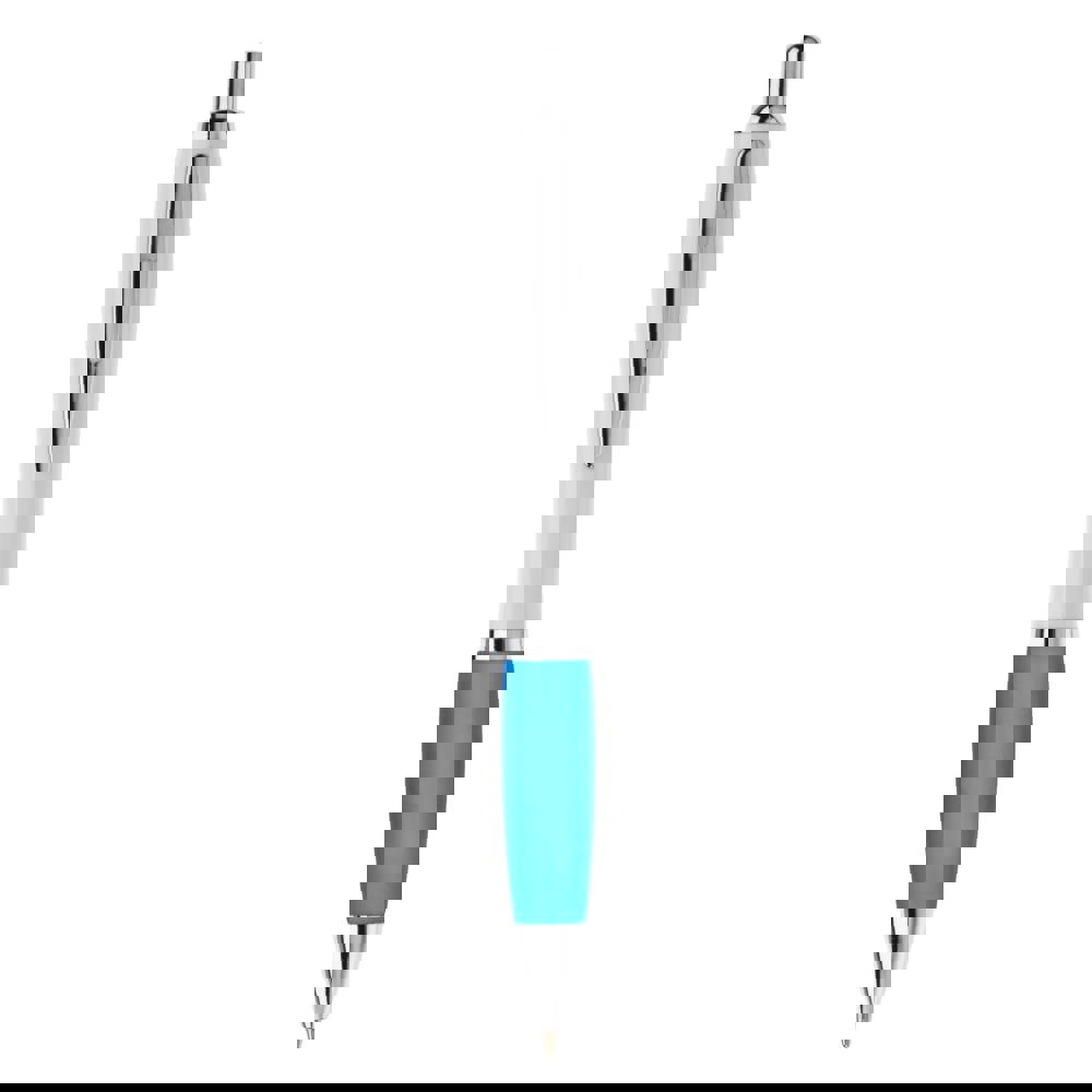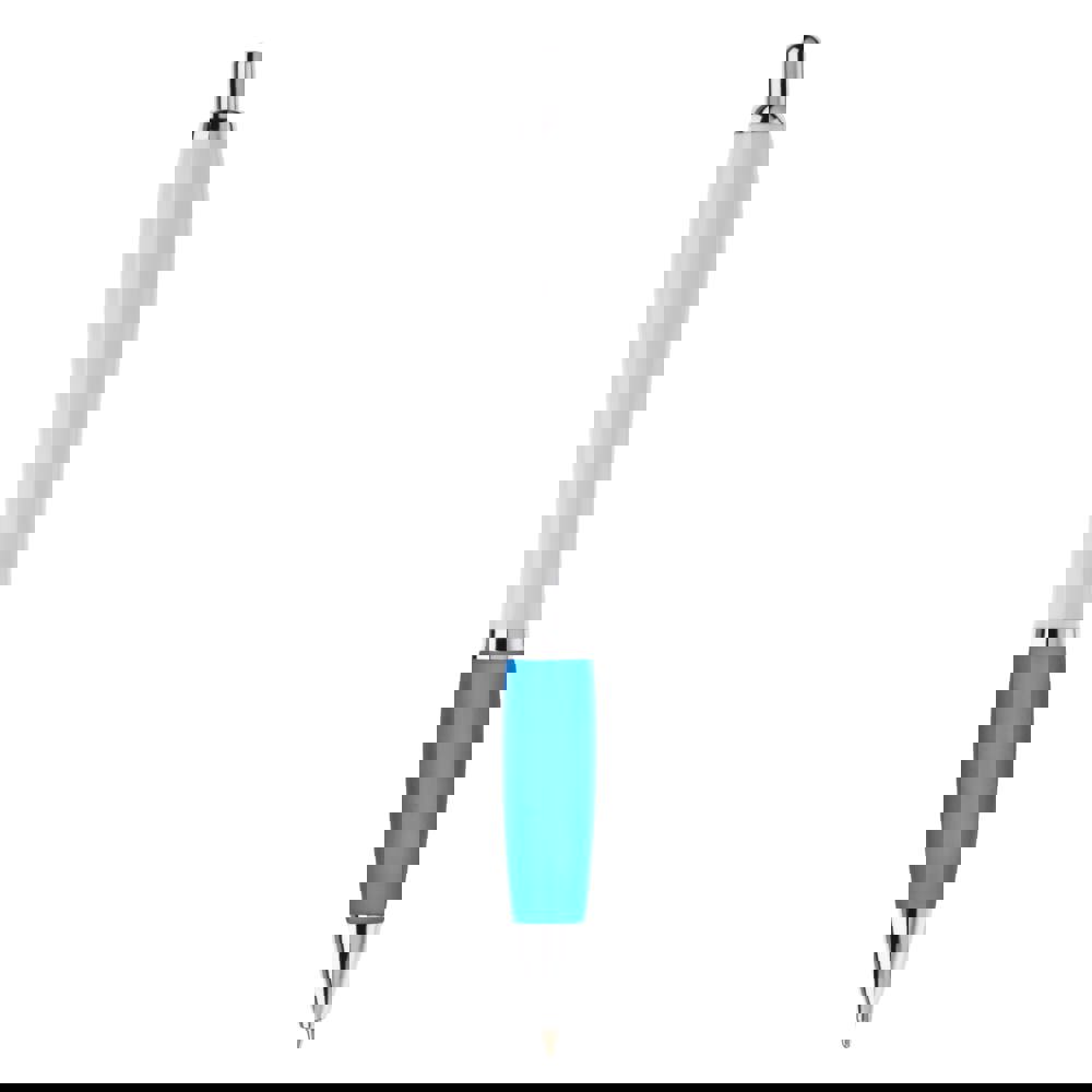 Witte balpen met metalen clip en metal look drukknop, ring en punt. De pen bevat een blauwschrijvende Jumbo vulling.