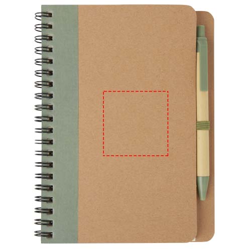 Notitieboek met omslag van gerecycled papier met 60 vellen gerecycled lijntjespapier en bijpassende pen. Notitieboek en pen samen verpakt.