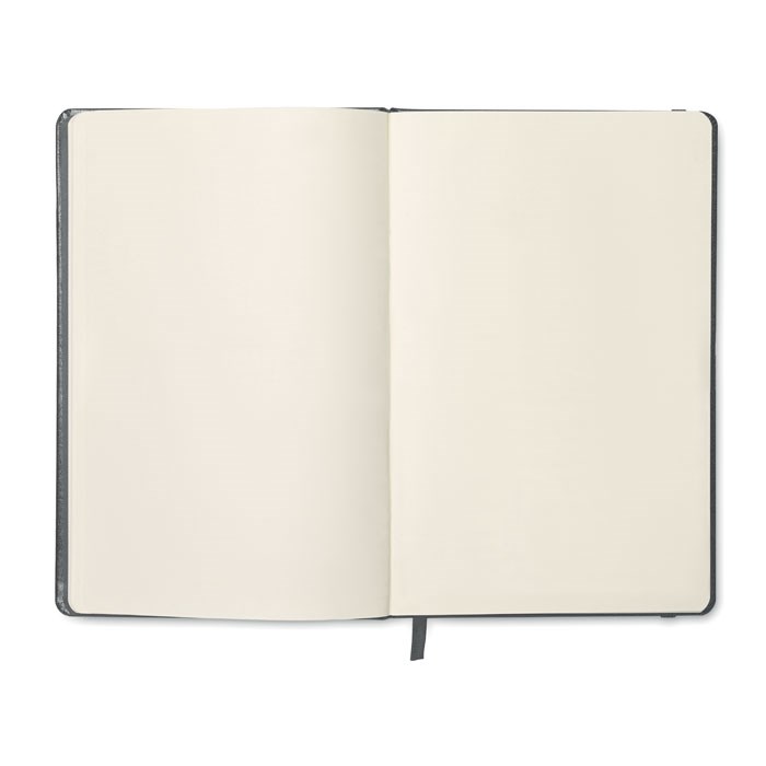A5 notitieboek met harde PU kaft. Gebonden. 192 pagina's van blanco gerecycled papier (96 vellen). Bijpassende elastische sluitingsband en paginamarkering met lint. FSC®-certified | FSC MIX CREDIT, P7.1, FSC-C213206