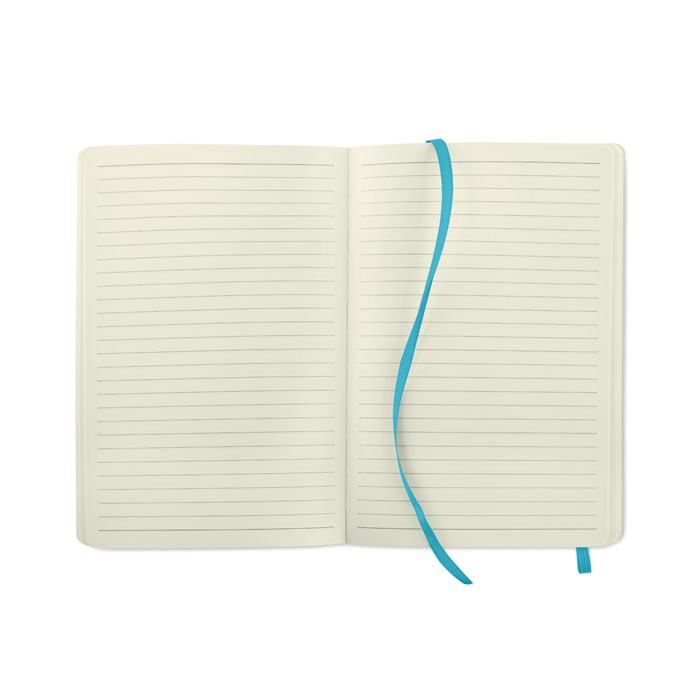 A5 notitieboek met zachte omslag van gerecycled PU. Ingebonden. 160 gelinieerde pagina's (80 vellen) recycle papier. Bijpassende elastische sluitingsband en lint als bladwijzer. Uitbreidbaar binnenvak achterin. FSC®-certified | FSC MIX CREDIT, P7.1, FSC-C213206