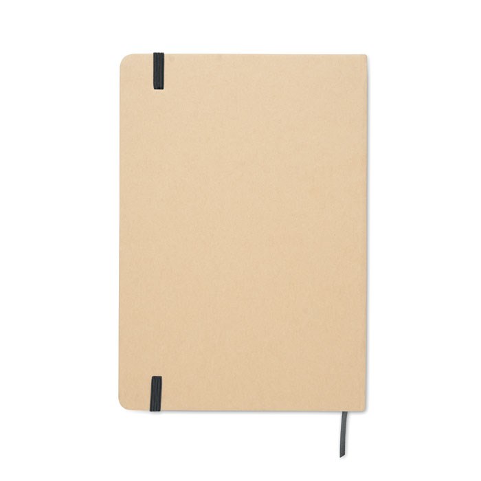 A5 notitieboekje met harde gerecycled kartonnen kaft. Beige kaft. Gebonden. 160 pagina's gelinieerd gerecycled papier (80 vellen). Elastische sluitingsband, bladwijzerlint in bijpassende kleur. Na lasergraveren komt de kleur tevoorschijn. FSC®-certified | FSC MIX CREDIT, P7.1, FSC-C213206