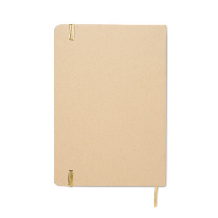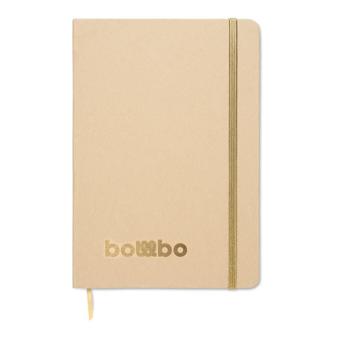 A5 notitieboekje met harde gerecycled kartonnen kaft. Beige kaft. Gebonden. 160 pagina's gelinieerd gerecycled papier (80 vellen). Elastische sluitingsband, bladwijzerlint in bijpassende kleur. Na lasergraveren komt de kleur tevoorschijn. FSC®-certified | FSC MIX CREDIT, P7.1, FSC-C213206