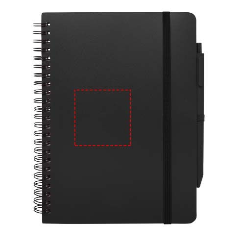 Het Thalaasa A5 notitieboek met harde kaft is gemaakt van ocean-bound plastic en heeft 80 gelinieerde vellen crèmekleurig papier van 70 g/m². Het notitieboek heeft afgeronde hoeken, een elastische sluiting en een pennenlus. De balpen met zwarte inkt is ook gemaakt van gerecycled plastic uit de oceaan. Schrijflengte: 1000 meter. Stiftmaat: 1,0 mm.