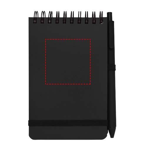Het Thalaasa A6 notitieboek met harde kaft is gemaakt van ocean-bound plastic en heeft 80 gelinieerde vellen crèmekleurig papier van 70 g/m². Het notitieboek heeft afgeronde hoeken, een elastische sluiting en een pennenlus. De balpen met zwarte inkt is ook gemaakt van gerecycled plastic uit de oceaan. Schrijflengte: 1000 meter. Stiftmaat: 1,0 mm.