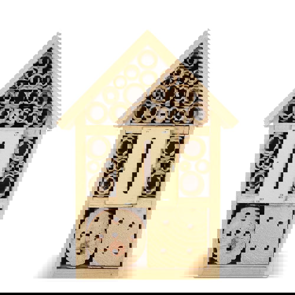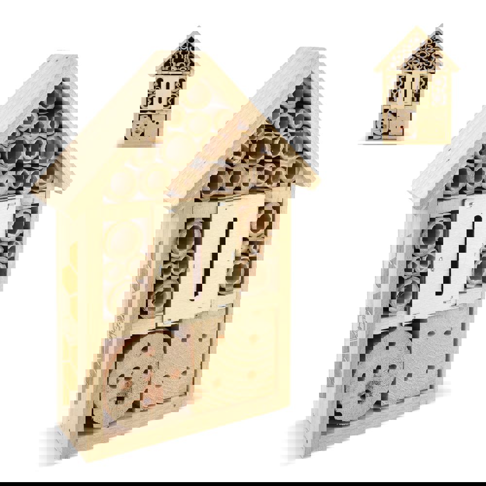 FSC-houten insectenhotel dat onderdak biedt aan lieveheersbeestjes, gaasvliegen en solitaire bijen. Ondersteunt de biodiversiteit door bestuiving en natuurlijke ongediertebestrijding. Ideaal voor tuinen en balkons, duurzaam en leerzaam, waardoor het een doordacht relatiegeschenk is.