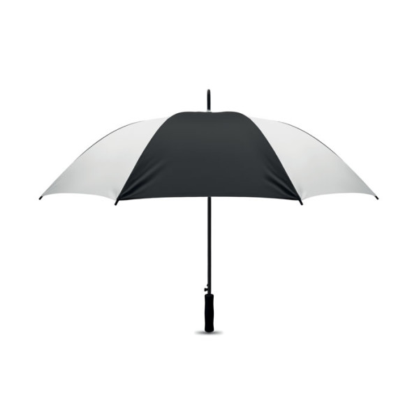 27 Inch paraplu van pongee met EVA handvat. Zwart metalen frame met kunststof zwarte uiteinde. Opent automatisch.